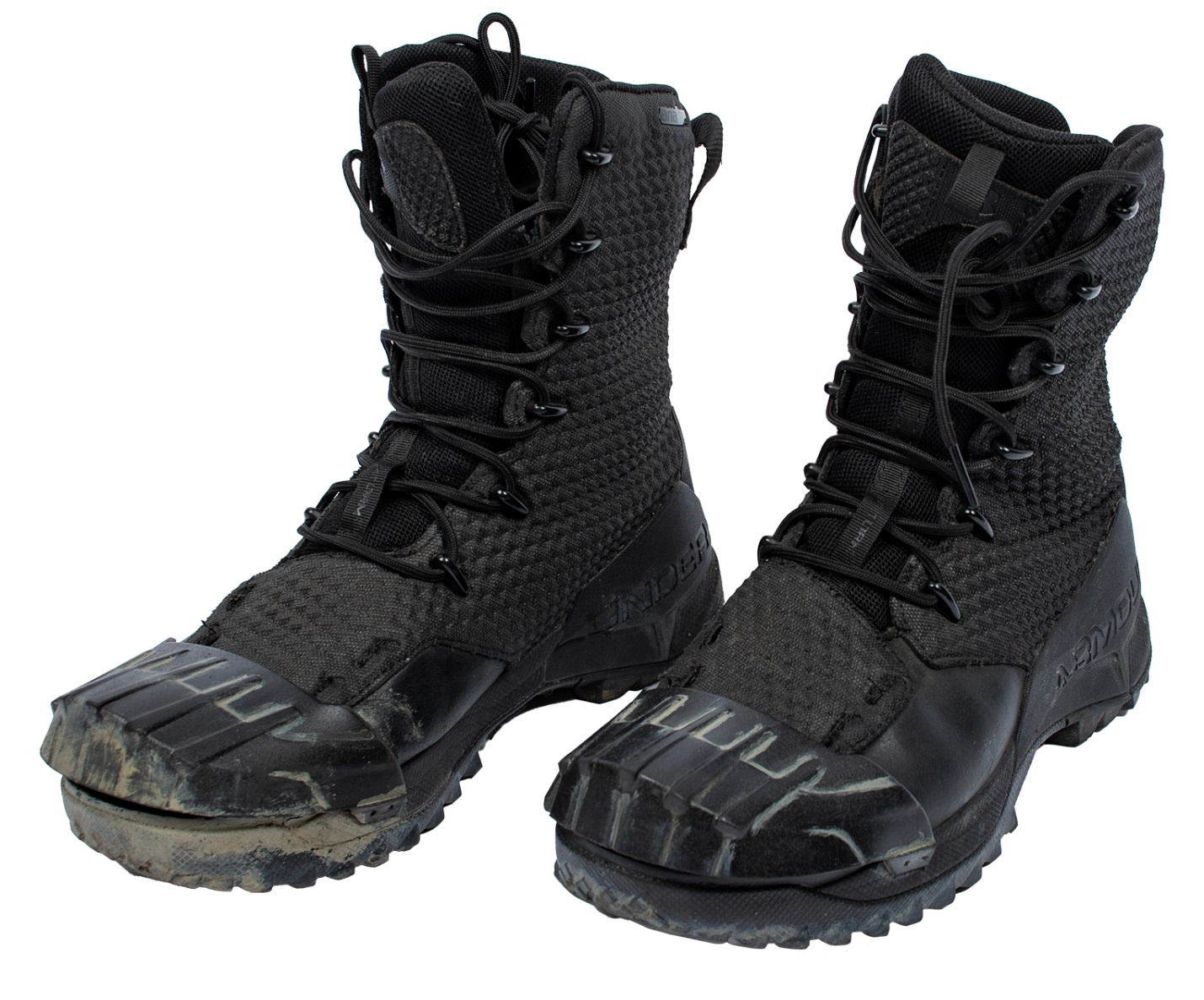 - Boots are Merrell Coldpack Ice+ 8" zip-up snow boots, Under Armour Infil Ops GTX boots, or direct replicas with accurate toe details.