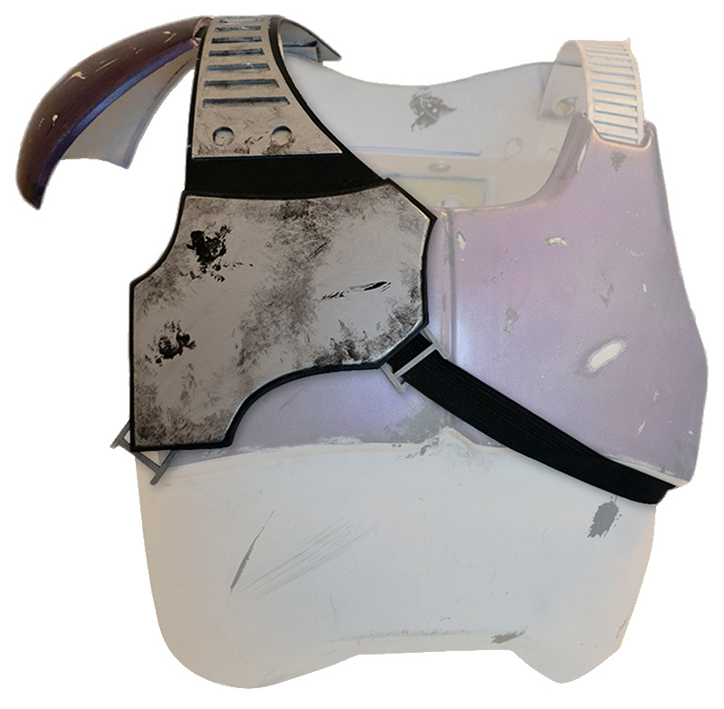 - Rear shoulder strap attaches to shoulder armor plate with a silver buckle.