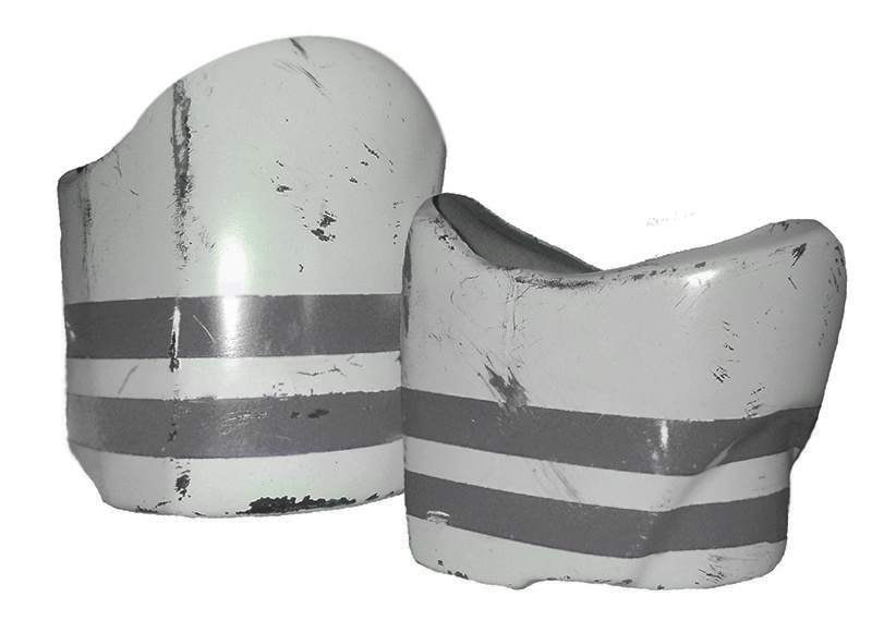 - Knees are strapped to the leg via a white strap with a raised center area that wraps around the leg and connects on both sides of the Knee.