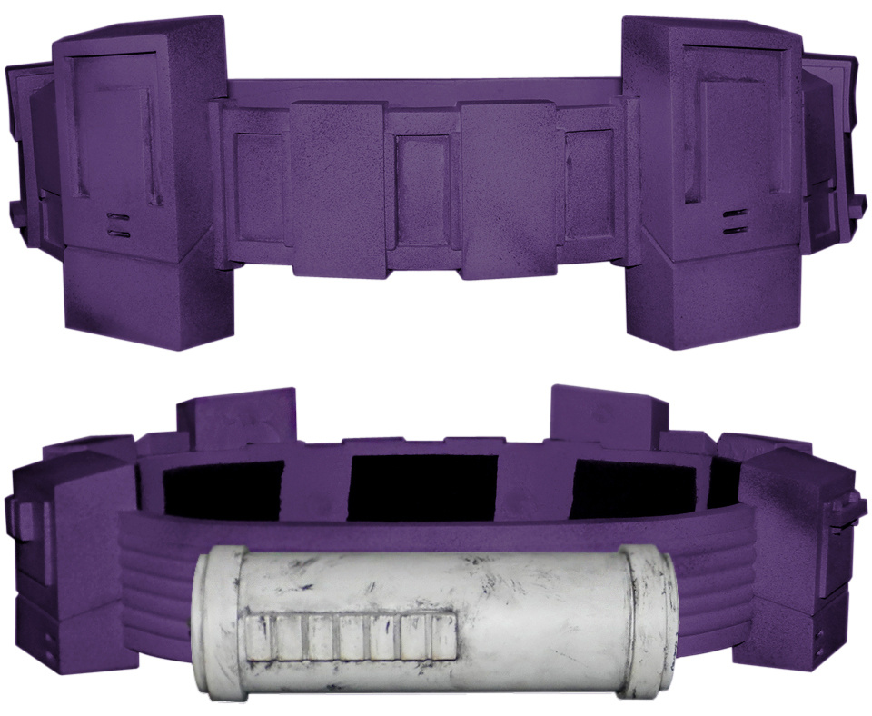 - Attached to the top of the harness, and placed over the right shoulder, is a purple colored spaulder.