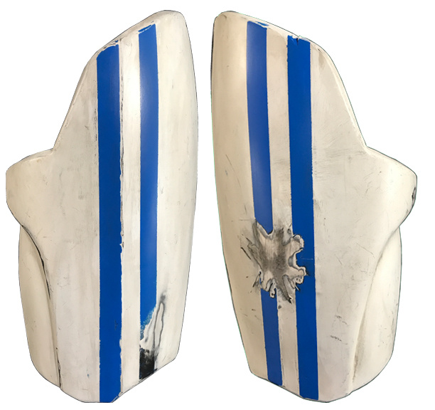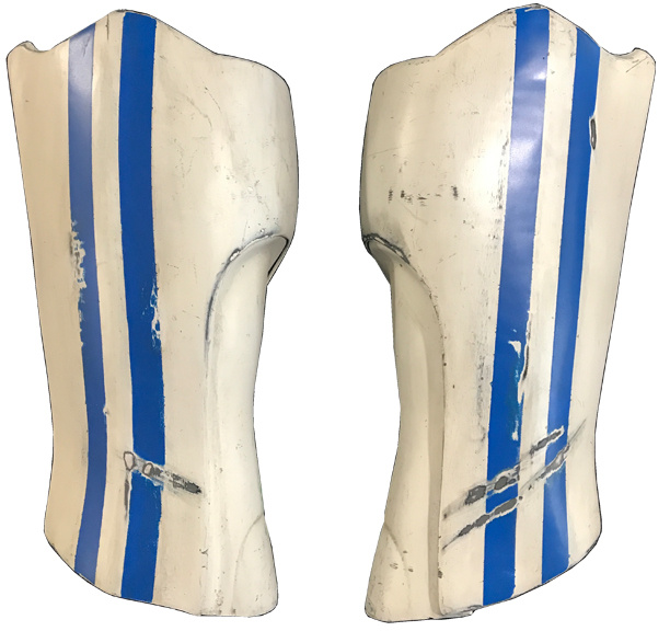 - Two parallel vertical blue stripes about 1/2 inch wide each and 3/4 inch apart run down the center of the outside facing side of each lower leg armor.
