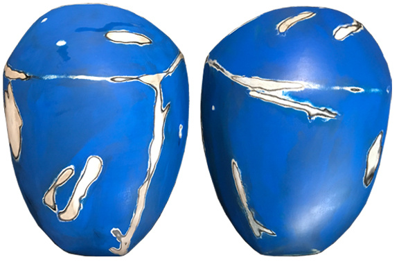 - Blue pillar design flares outward along bottom edge, about 3 1/2 inches in length, creating about a 3/4 inch blue border on surface that tappers to about 1/2 inch. Blue carries over beveled indented edge along abdomen. Flares end in vertical cut edges.