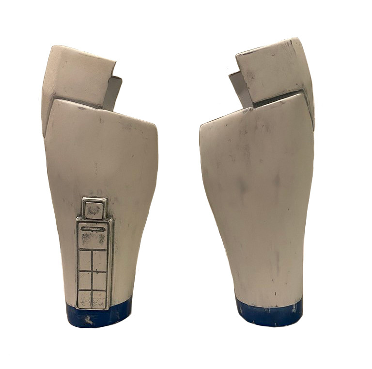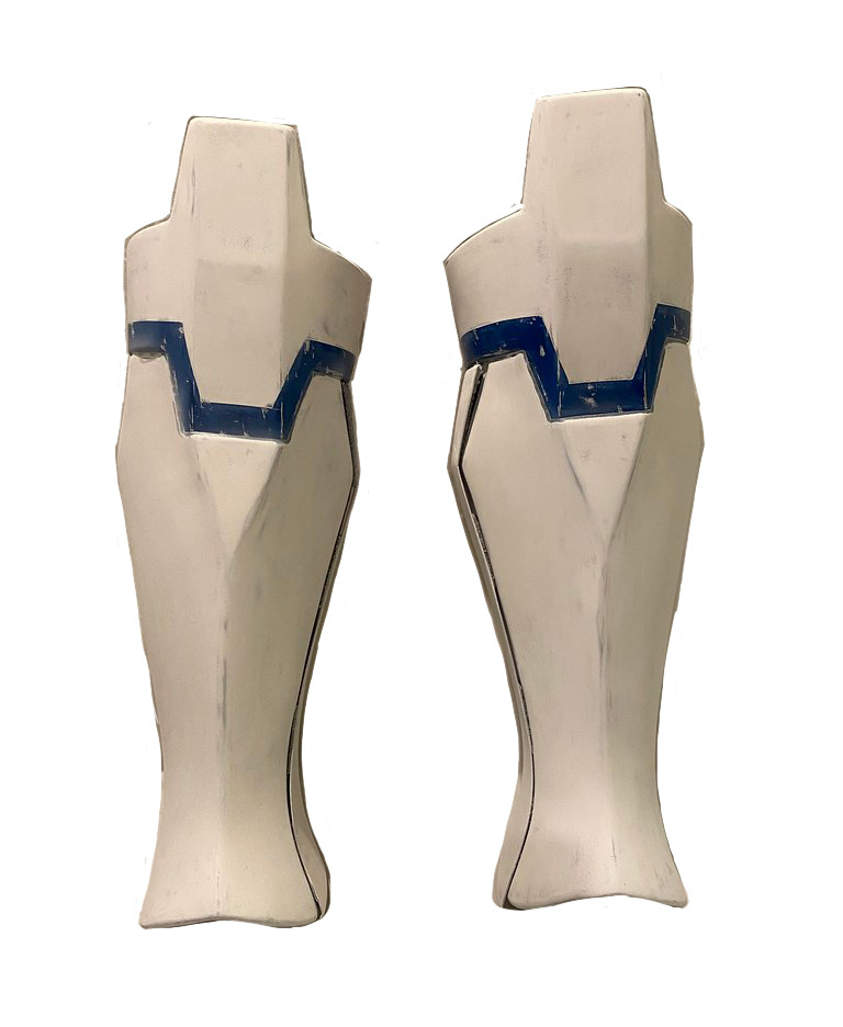 - The front of the armor has a triangular detail just below the knee and a hard ridge line down the front of the shin.