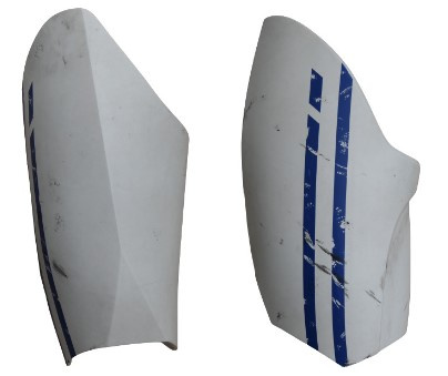 - Blue stripe edge follows the bottom curve of knee armor with about a 1 1/4 inch width. Top of blue curve pattern creates a white downward point just below elevated vertical rectangle.