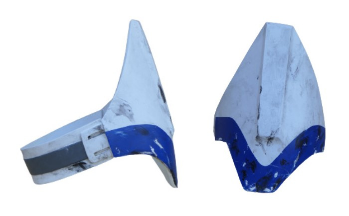 - Front of lower leg has a flat triangular detail at the top which transitions to a ridge line that travels down the front of the armor to the ankle.