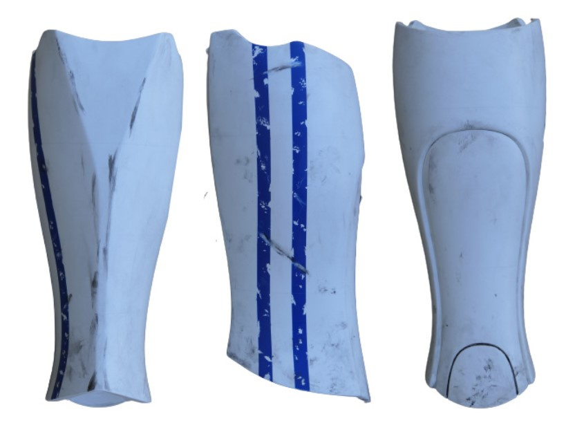 - Two parallel vertical blue stripes about 1/2 inch wide each and 3/4 inch apart run down the center of the outside facing side of each lower leg armor.