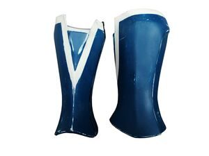 - The front of the armor has a triangular detail just below the knee and a hard ridge line down the front of the shin.