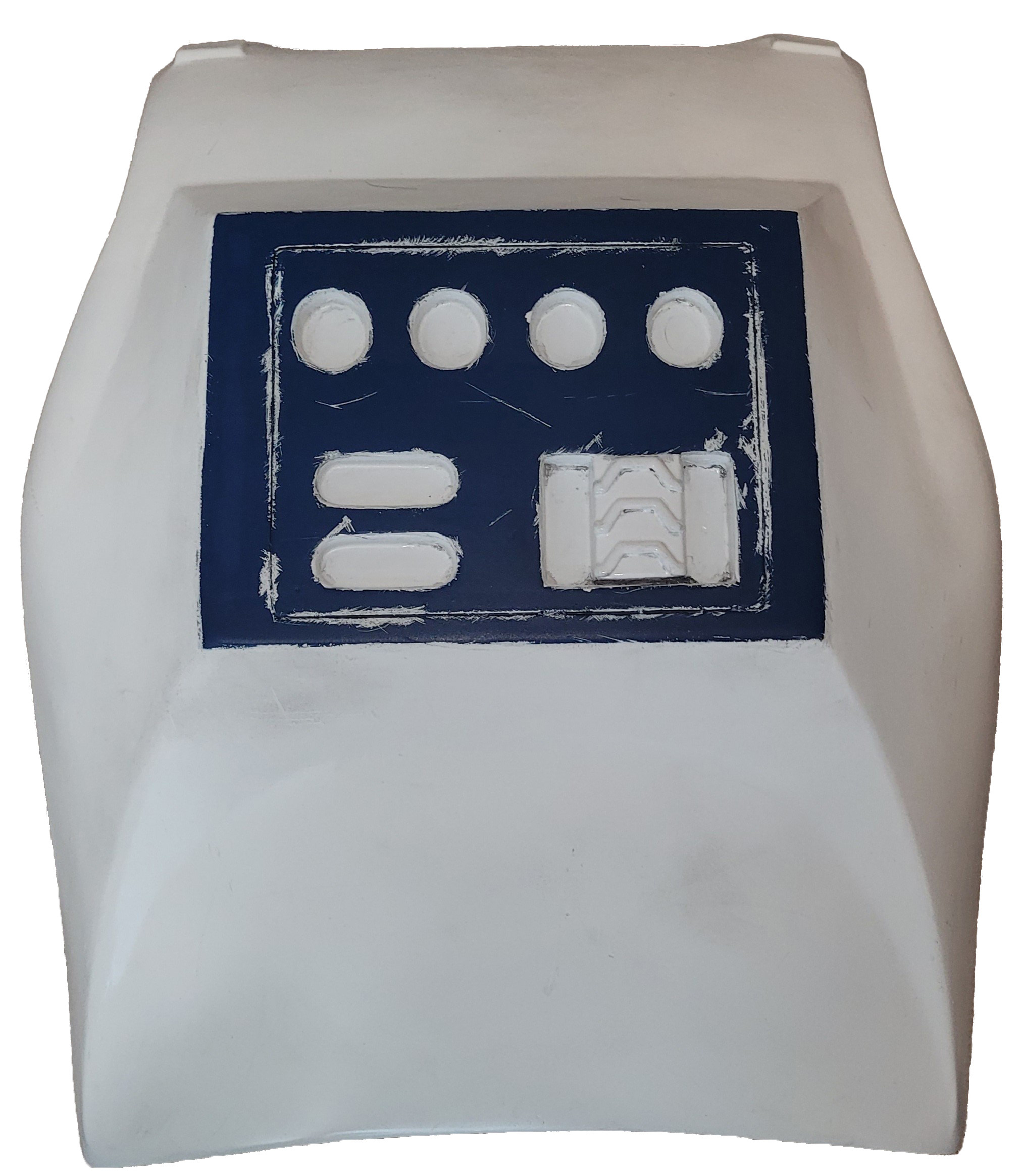 - Right forearm has a compad with 8 small buttons,1 large main button, and 1 slightly smaller rectangular button.