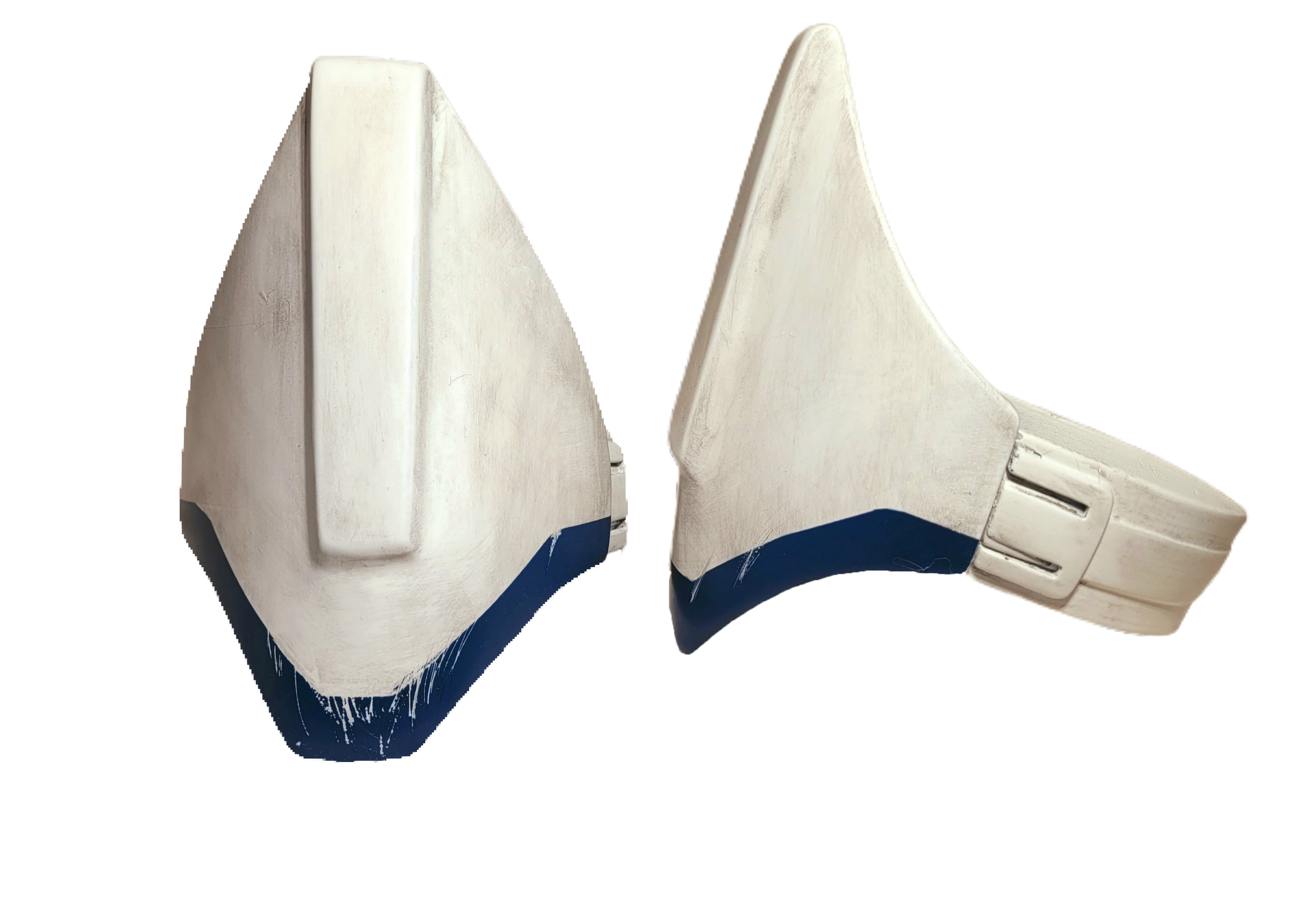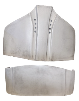 - Armor has two parallel dashed detail slots on each outside edge of elbow at the strap connection.
