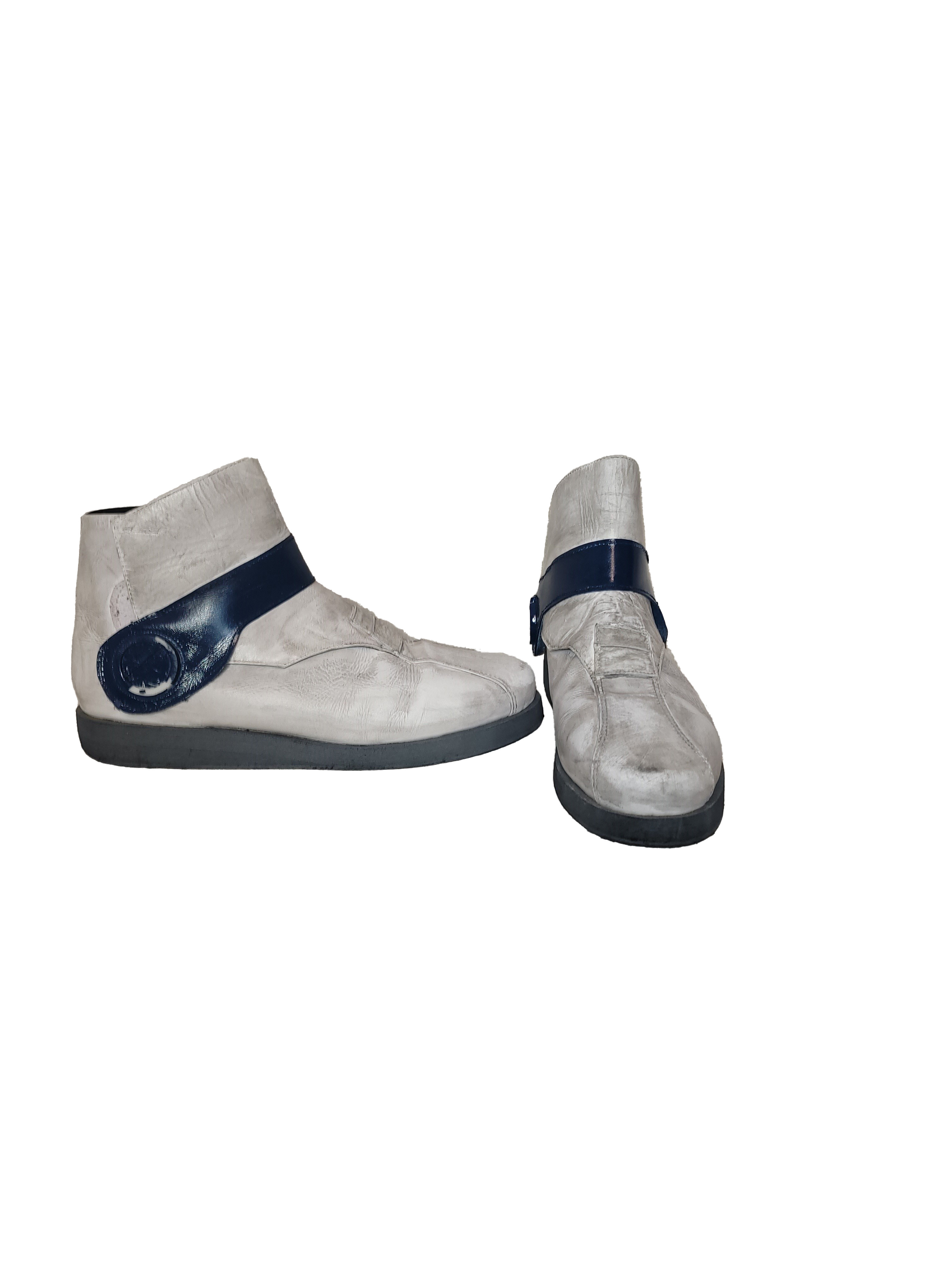 - Boots have a deep blue strap that goes over the top of the foot with two protruding blue disks at each side of the strap.