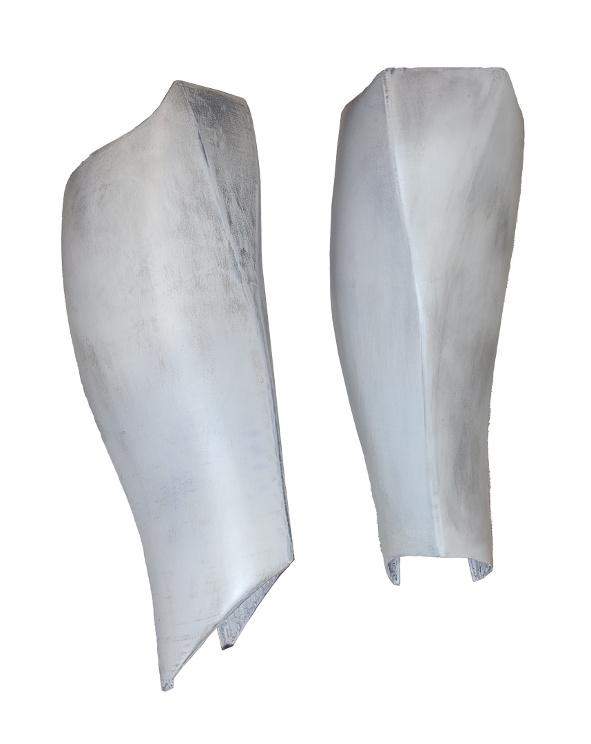 - The front of the armor has a triangular detail at the top of the leg and a hard ridge line down the front of the shin.