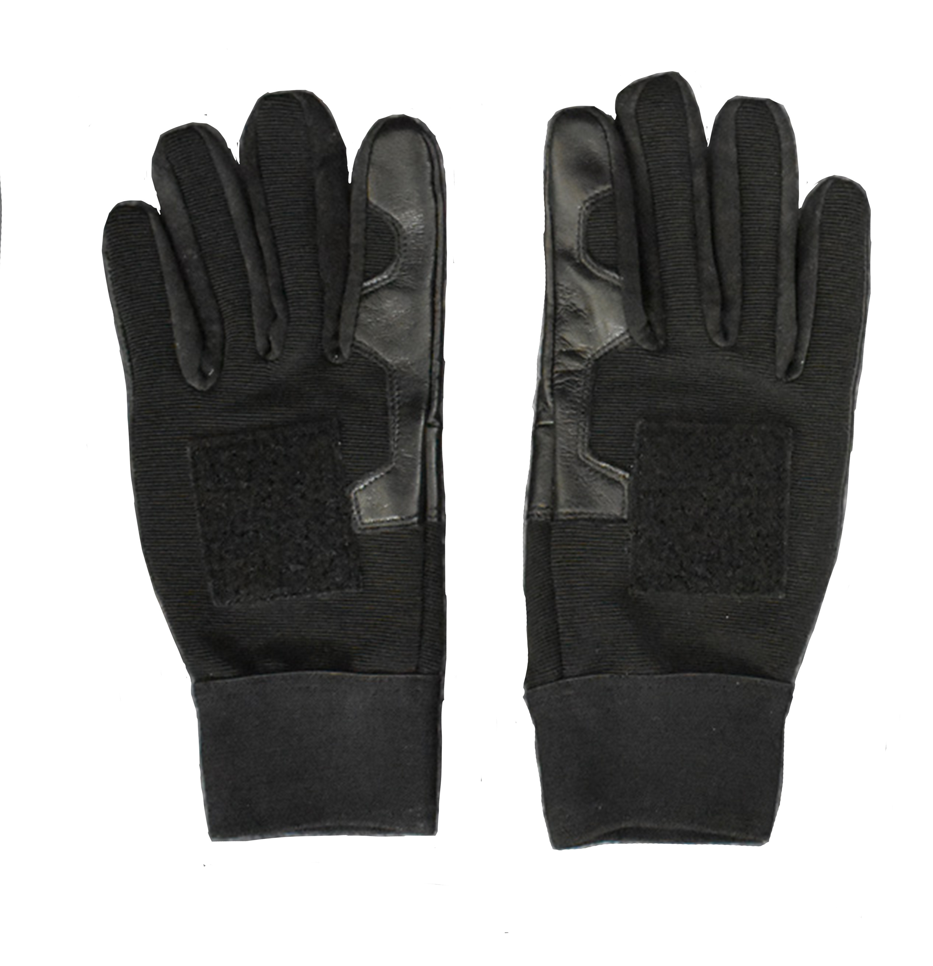 - Black gloves are made of fabric, with leather detailing on pointer finger.