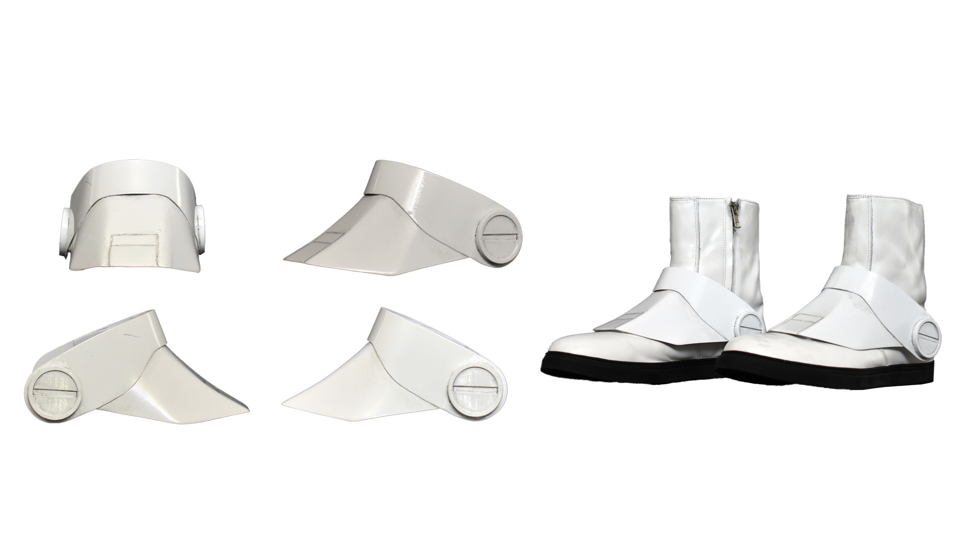 - Boot armor features two ankle disks with an arched rectangular panel that connects the two.
