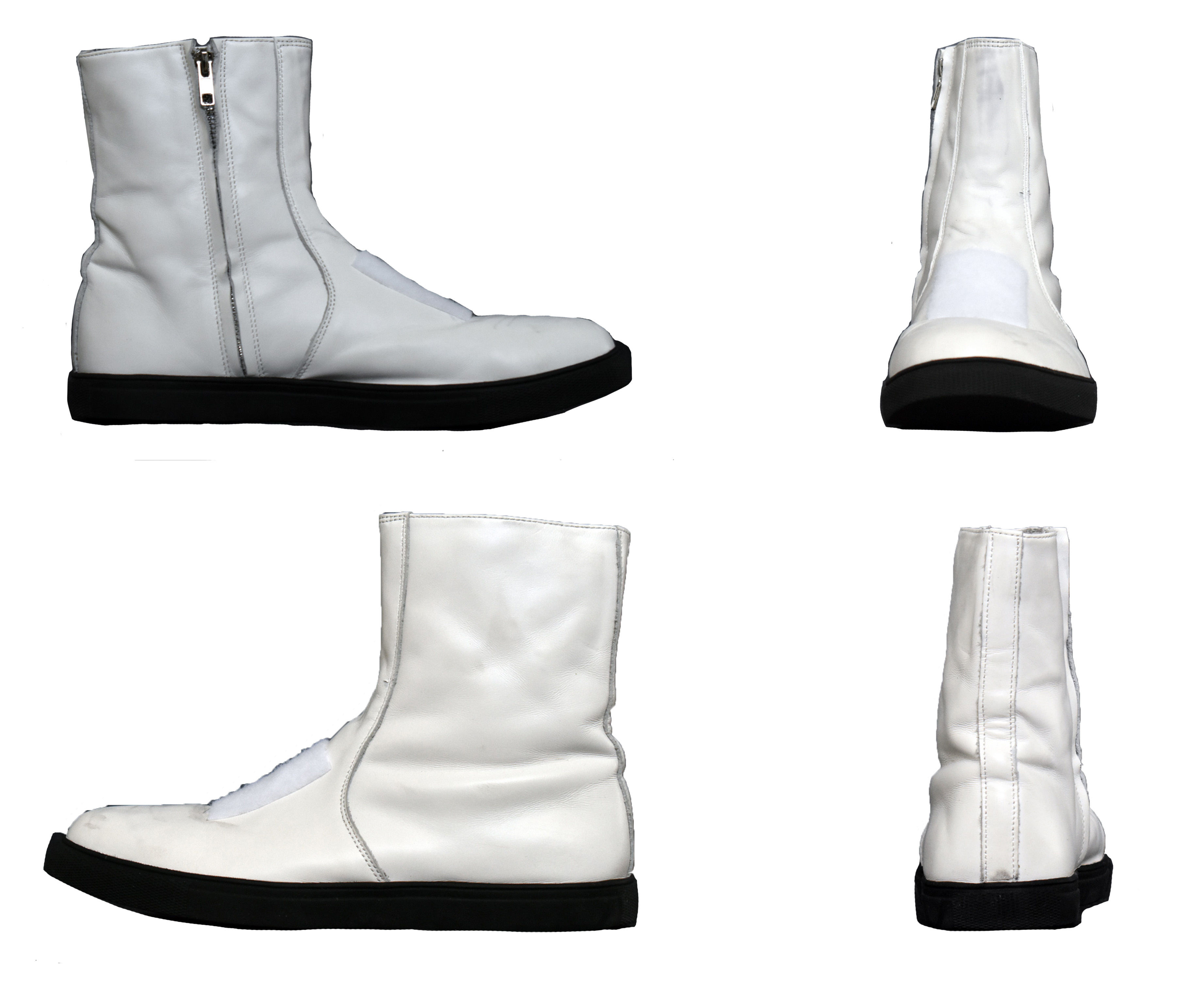- The boots are above-ankle height, and made of white leather or leather-like material.