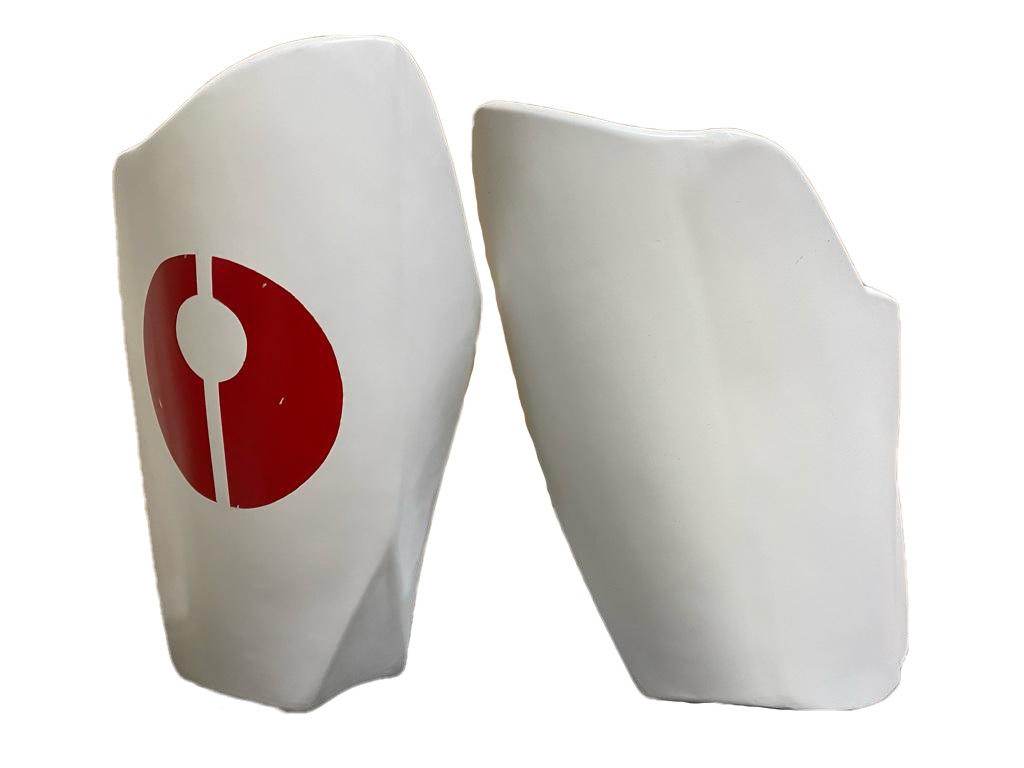 - Front of lower leg has a flat triangular detail at the top which transitions to a ridge line that travels down the front of the armor to the ankle.