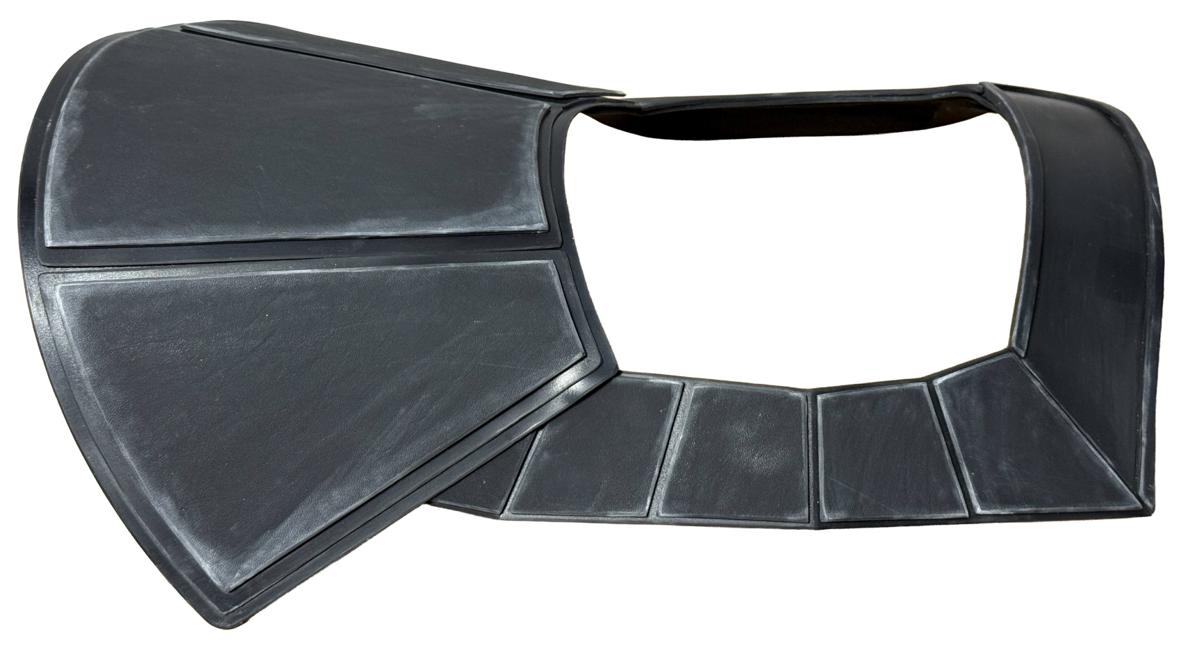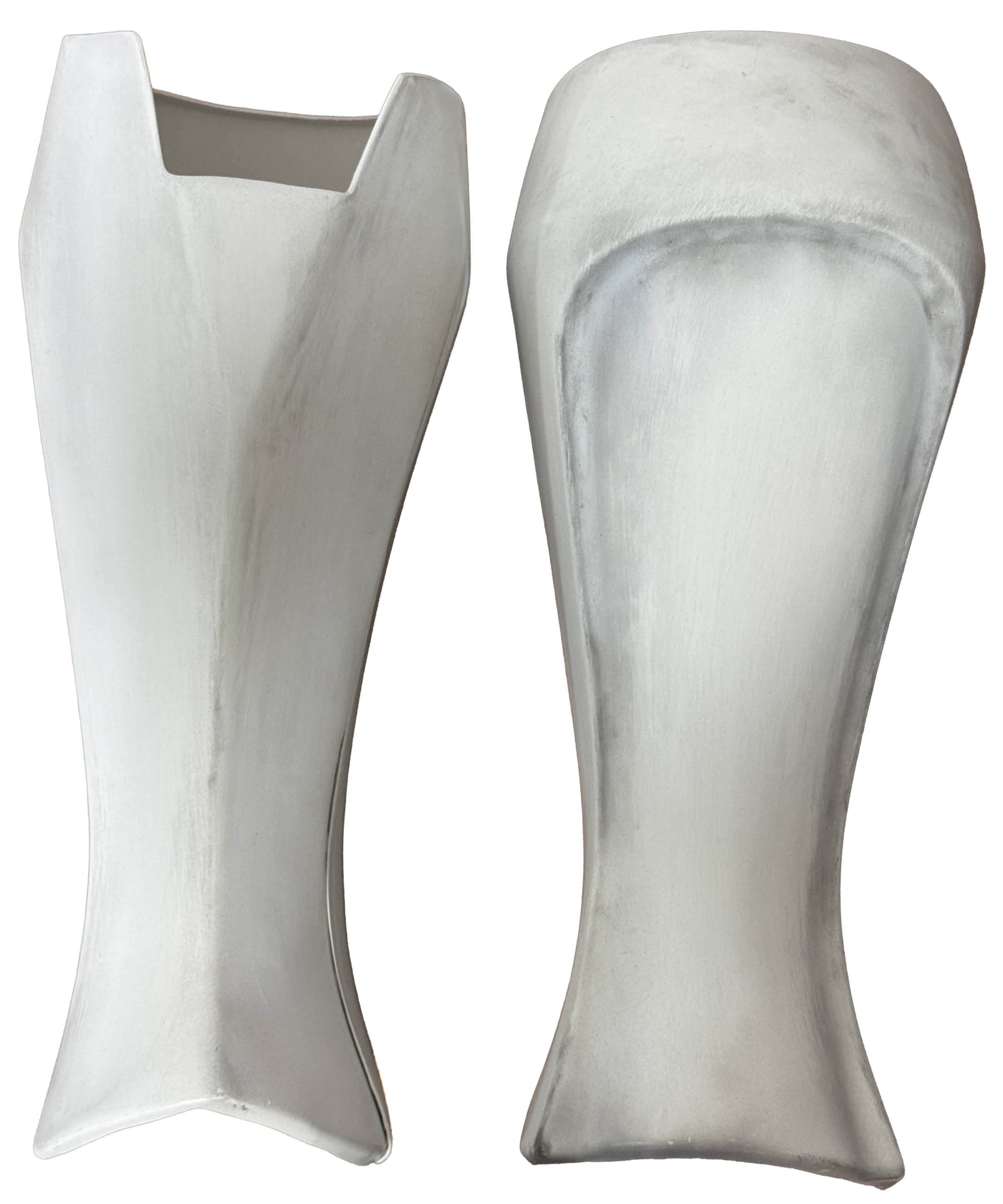 - Front includes a flat triangular area near the knee, with a notch cut-out for the knee plate.