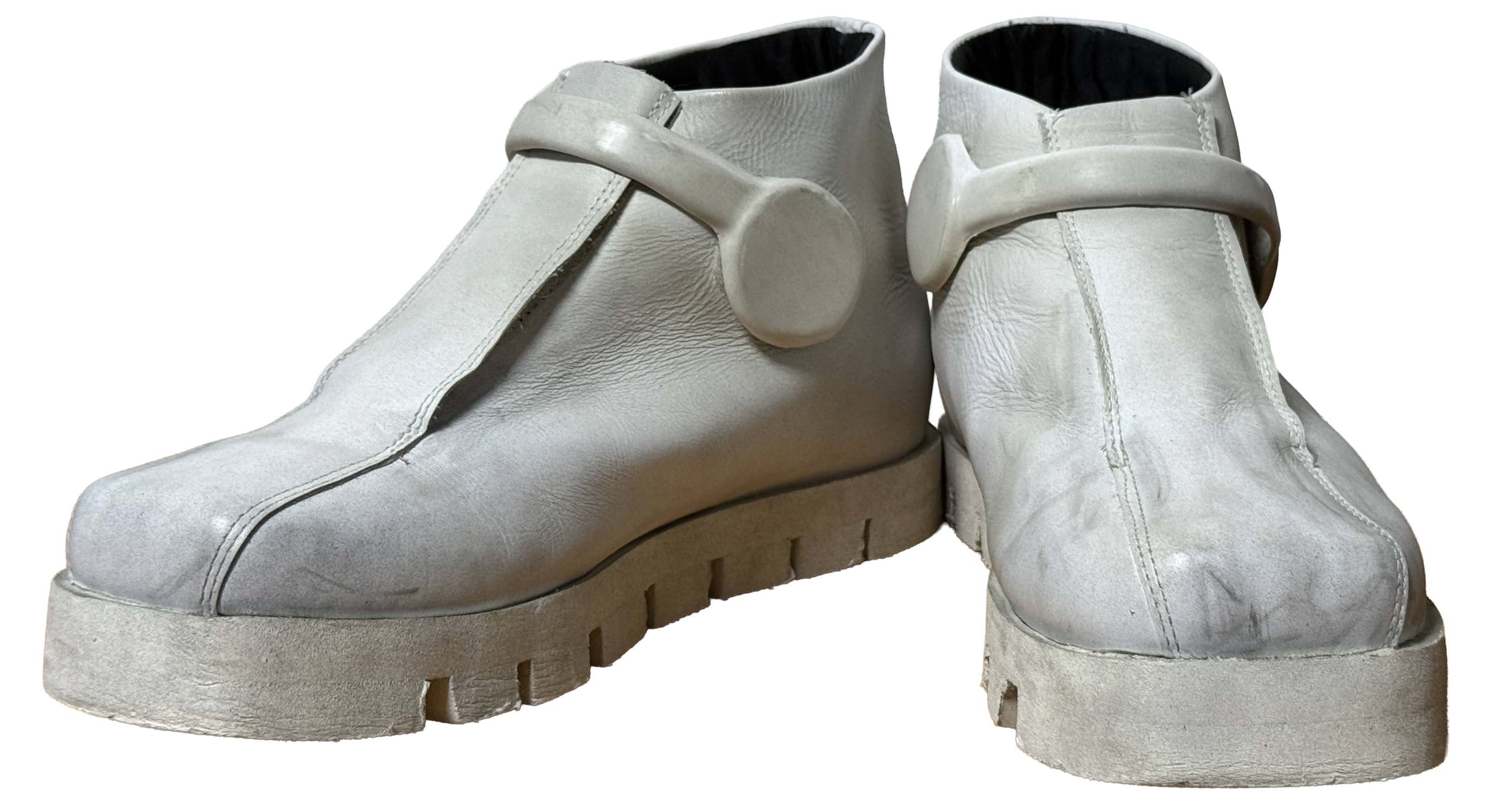 - White boots, ankle high or higher (no undersuit visible at the ankle).