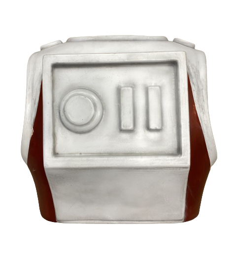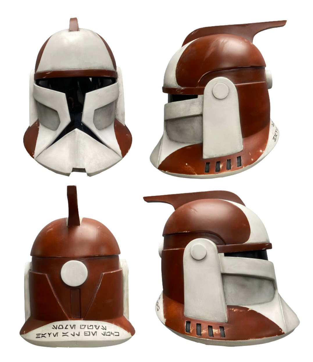 - Rear of helmet is painted rust brown, excluding the rear circular extruded detail and the bottom center of the helmet, which has a wide arch to make room for the Aurebesh text.