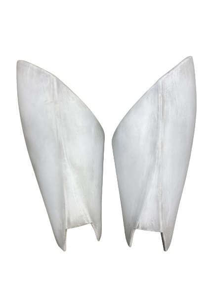 - Front of the thigh armor has a flat triangular area near the knee with a notch cut out for the knee armor.