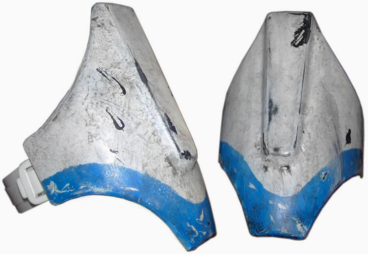 - Wrist end of forearm has a blue stripe, about 3/4 inch wide and spaced about 1/4 from wrist edge, wrapped around the armor.
