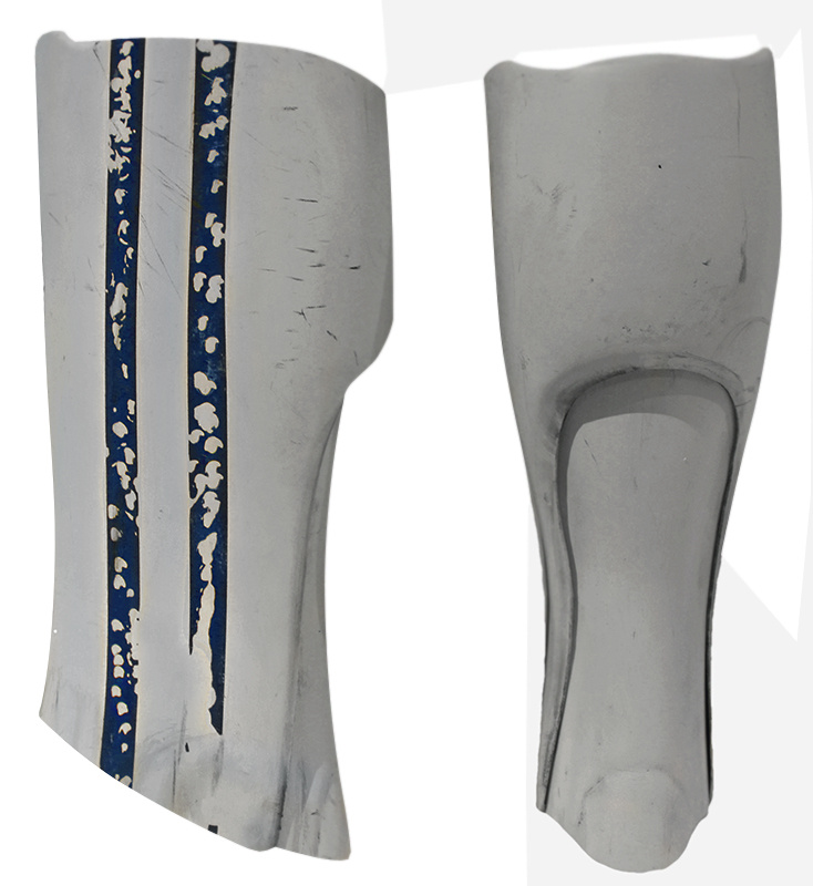 - Two parallel vertical blue stripes about 1/2 inch wide each and 3/4 inch apart run down the center of the outside facing side of each lower leg armor.