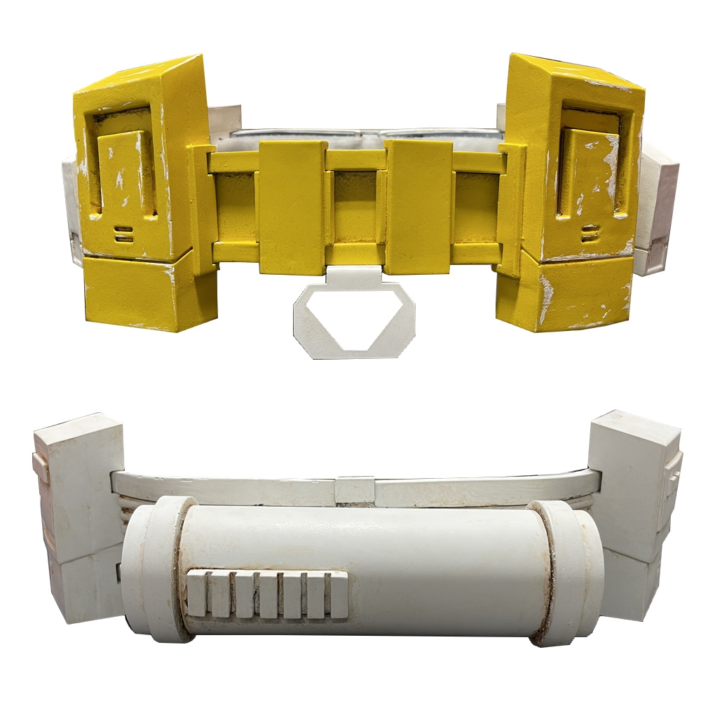 - Grey bandolier strap attaches to pauldron and terminates on right side belt box.