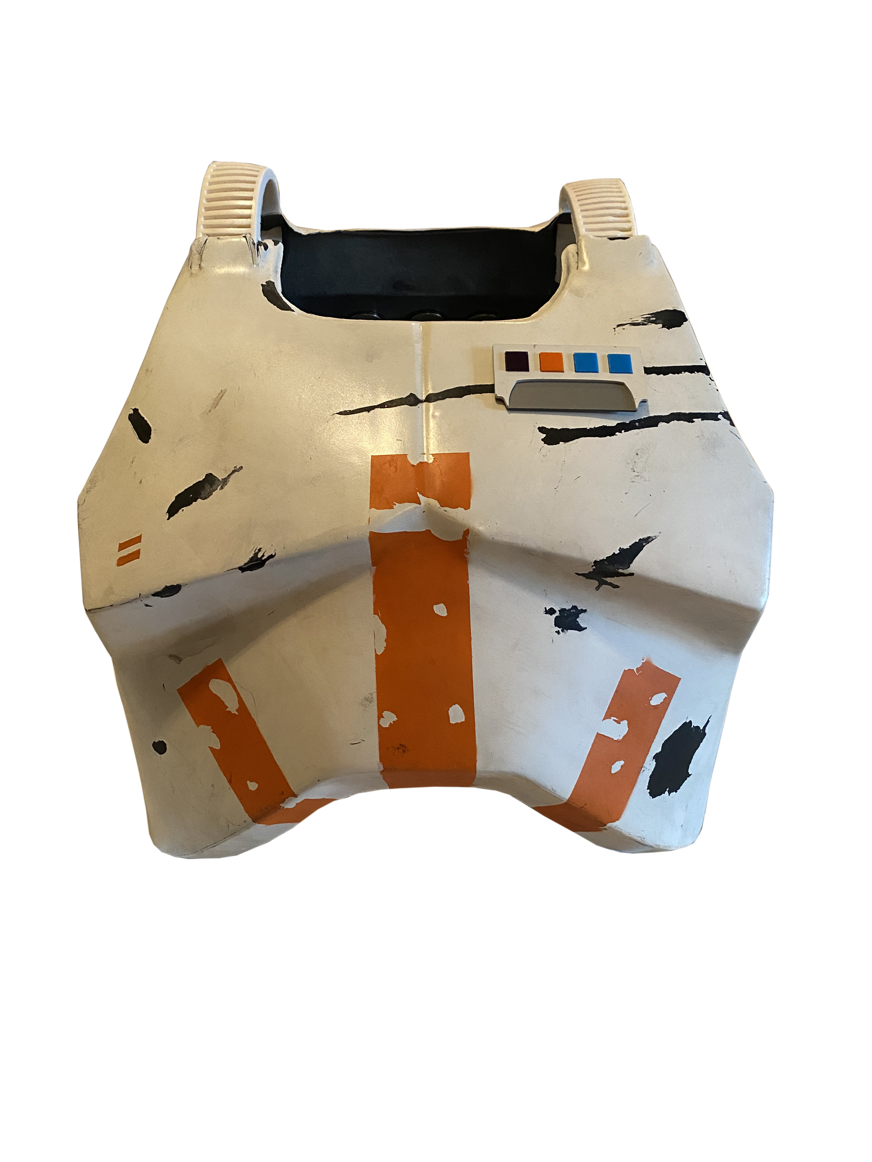 - Two recessed detail slots are present on the right breast, and painted orange.