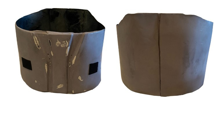 - On the right upper arm, there is a copper strap holding a “pen” that is mounted to the back of the armor.