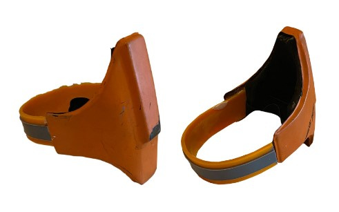 - Knee Armor is strapped to the leg via an orange strap with a raised center area that wraps around the leg and connects on both sides of the knee.