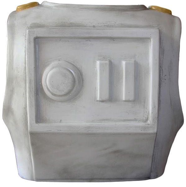 - Left forearm has a compad with 4 main square recessed areas and 1 slightly smaller square recessed area.