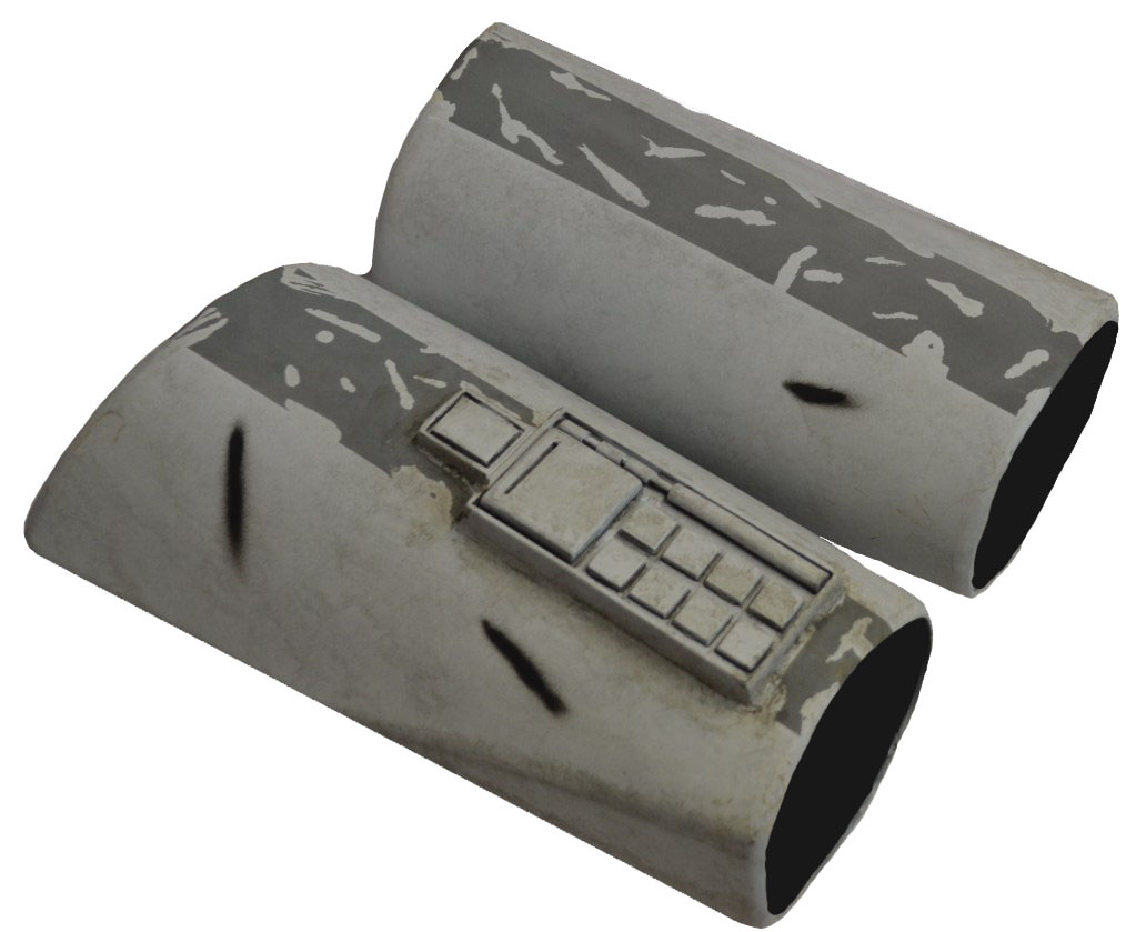 - On each elbow, on the outside of the body near the connection point of the elbow strap, there are detail slots that look like an equal symbols.