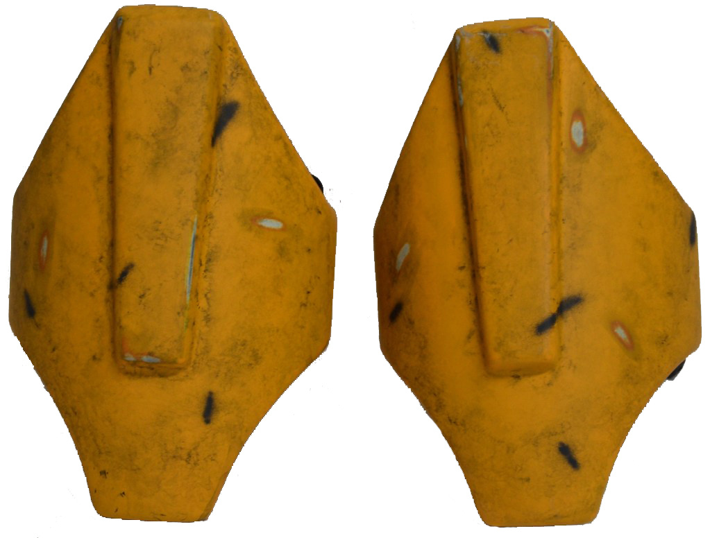 - Knees are strapped to the leg via a Light Orange strap with a raised center area painted in a light grey that wraps around the leg and connects on both sides of the Knee.