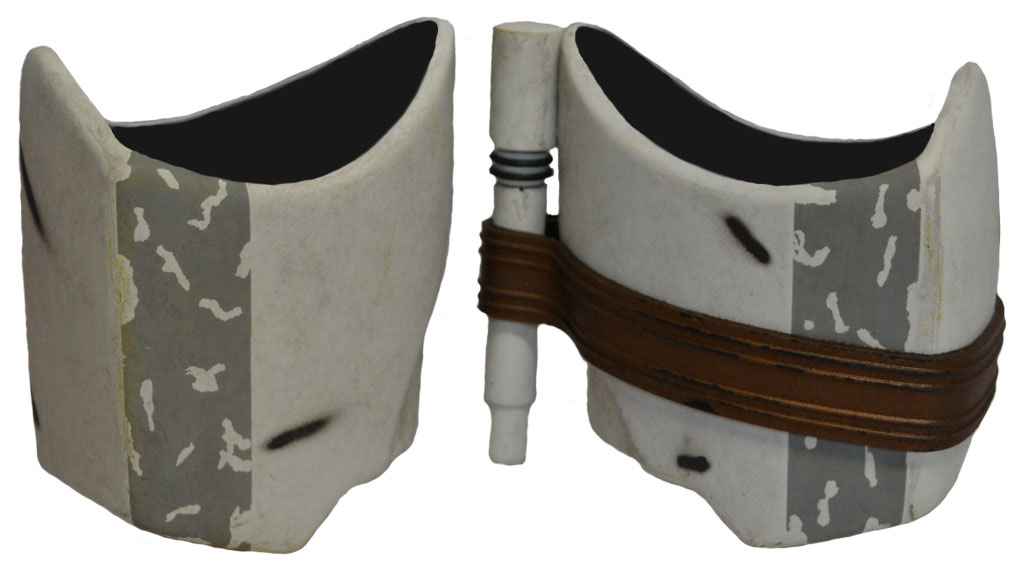 - On the right upper arm, there is a golden brown strap holding a “pen” that is mounted to the back of the armor.