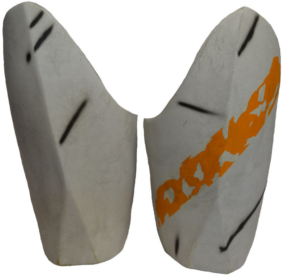 - The front of the armor has a triangular detail at the top of the leg and a hard ridge line down the front of the shin.