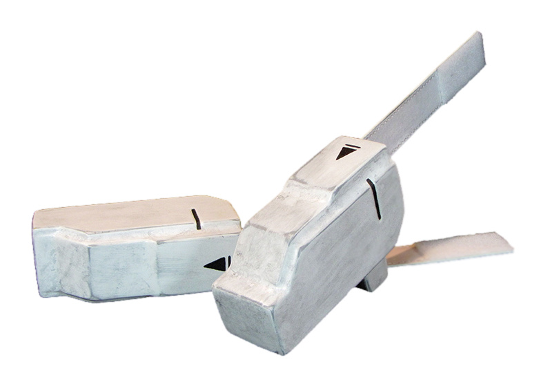 - Right rear box is spaced closer to detonator and has a bar with two small cylinders centered, and two dashed indented detail marks on bottom left.