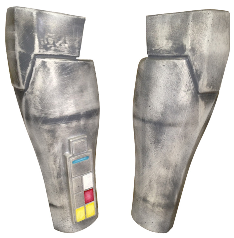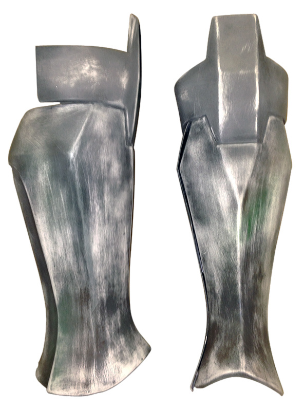 - Front of lower leg armor has a triangular detail just below the knee and a hard ridge line that runs down the front of the shin.