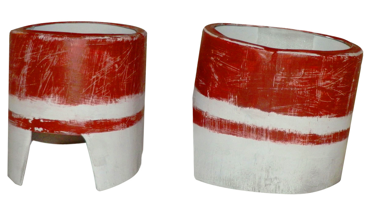 - A rust colored horizontal stripe is painted around the forearm, near the wrist.