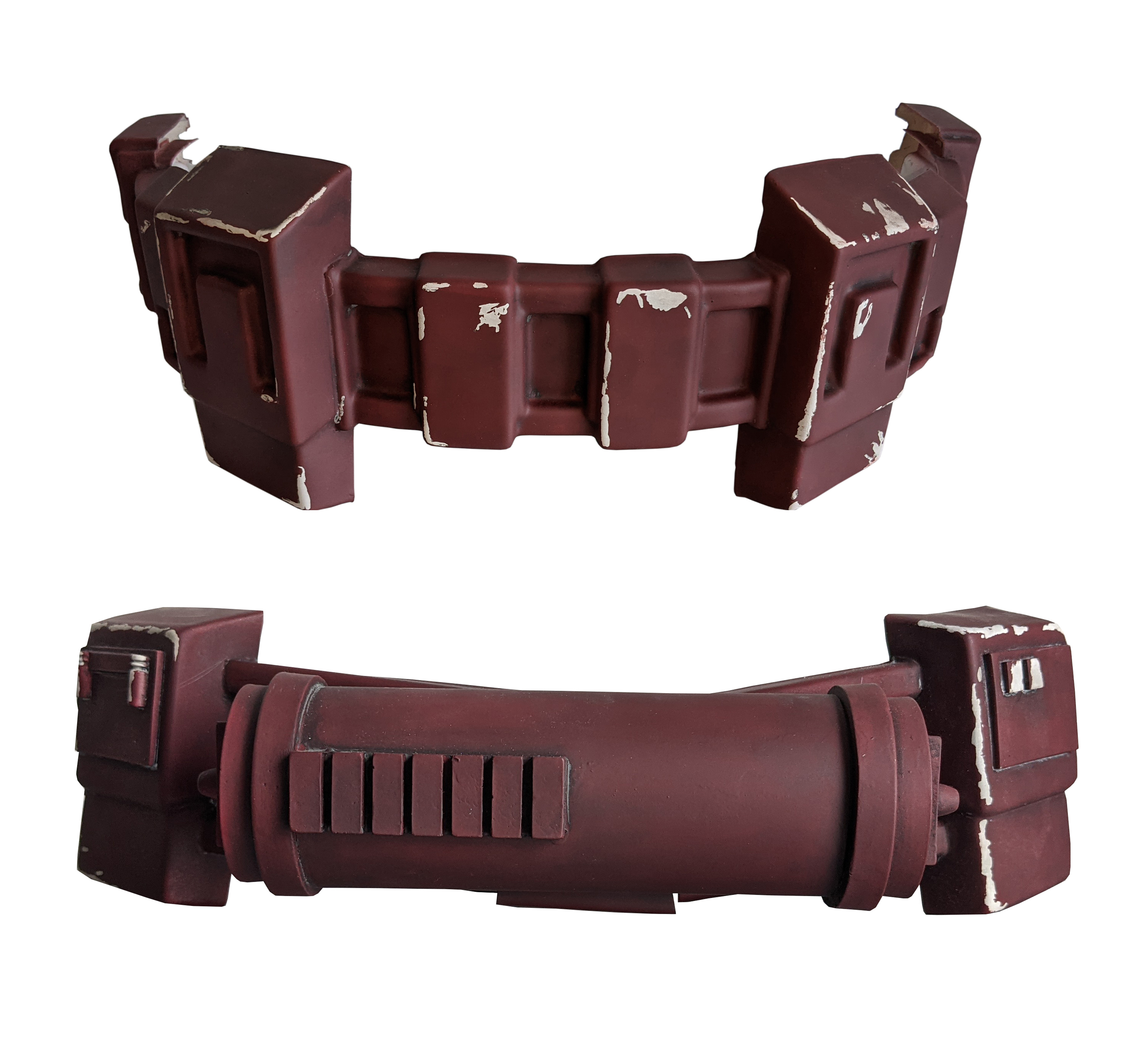 - Belt, boxes, and detonator are painted matte or satin white with maroon over top.
