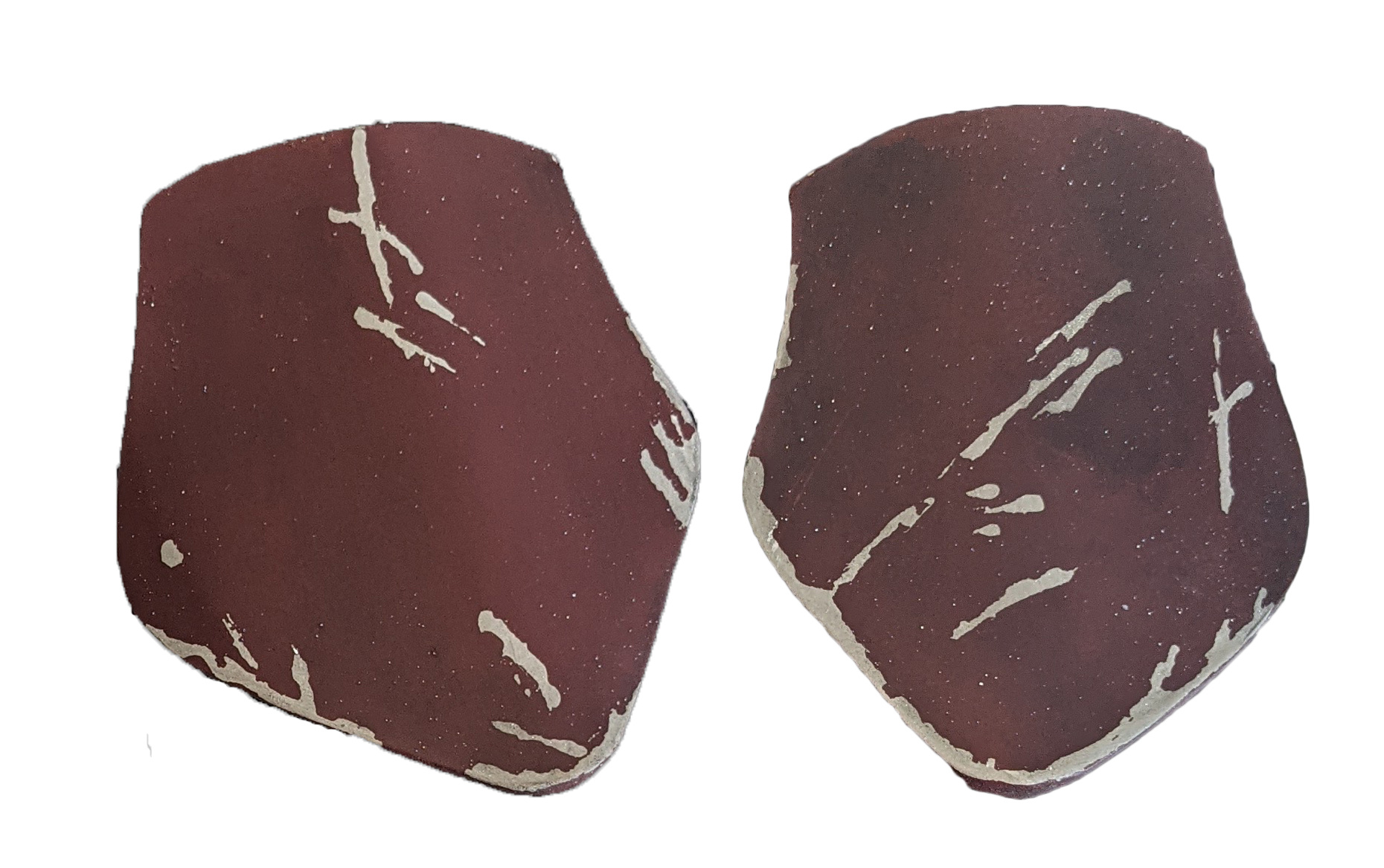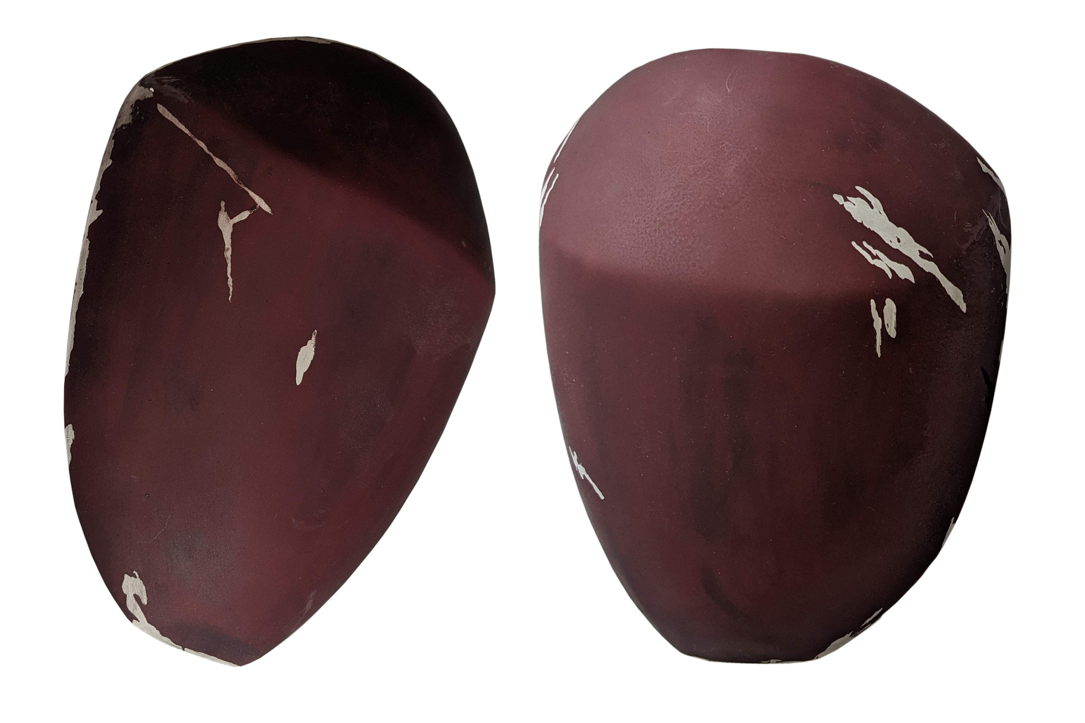 - The maroon areas are weathered with scuff marks that expose the underlying white.