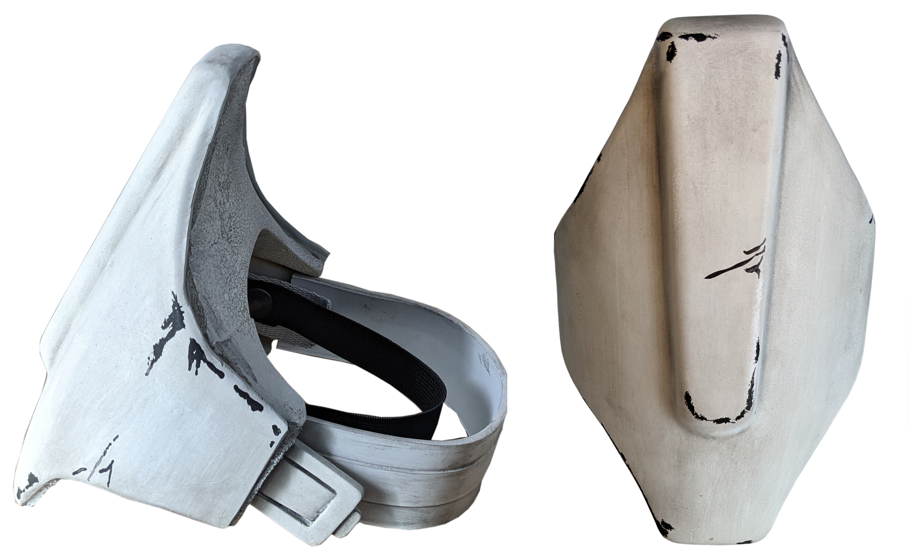 - Armor is weathered with shades of grey and scuff marks that expose the underlying white.
