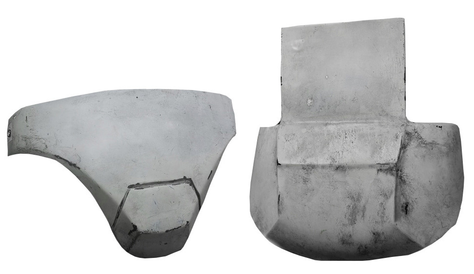 - Back of lower leg armor features arched indentation, just under the calf, that runs down towards the ankle.