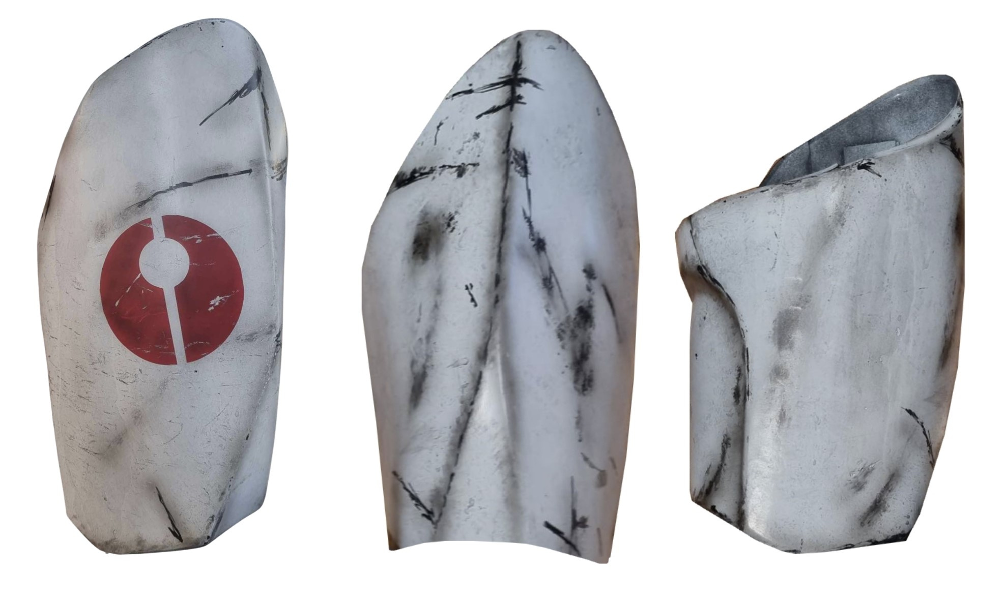 - Armor is weathered in shades of grey, with painted sections scuffed to show underlying white.