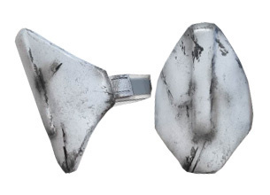 - The front of the armor has a triangular detail at the top of the leg and a hard ridge line down the front of the shin.