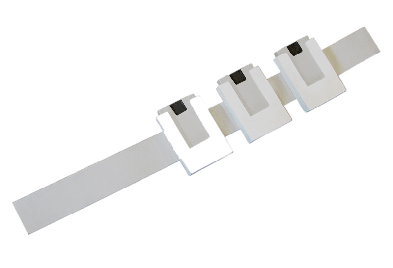 - A white colored flat strap, about 2 inches wide, wraps around back of leg.