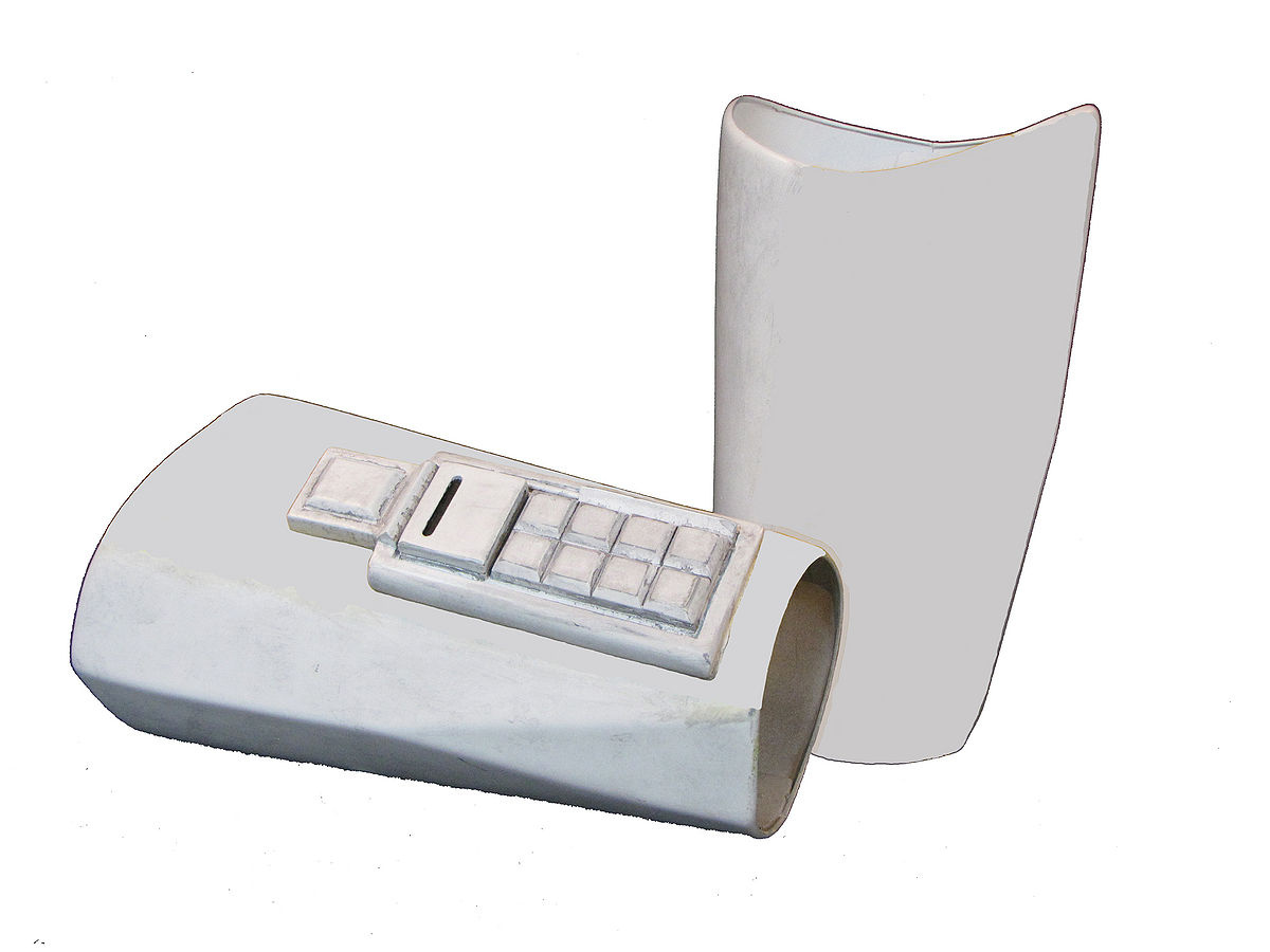 - Left rear box is spaced closer to detonator and has two square buttons in the top left corner, and two dashed indented detail marks on the bottom right.