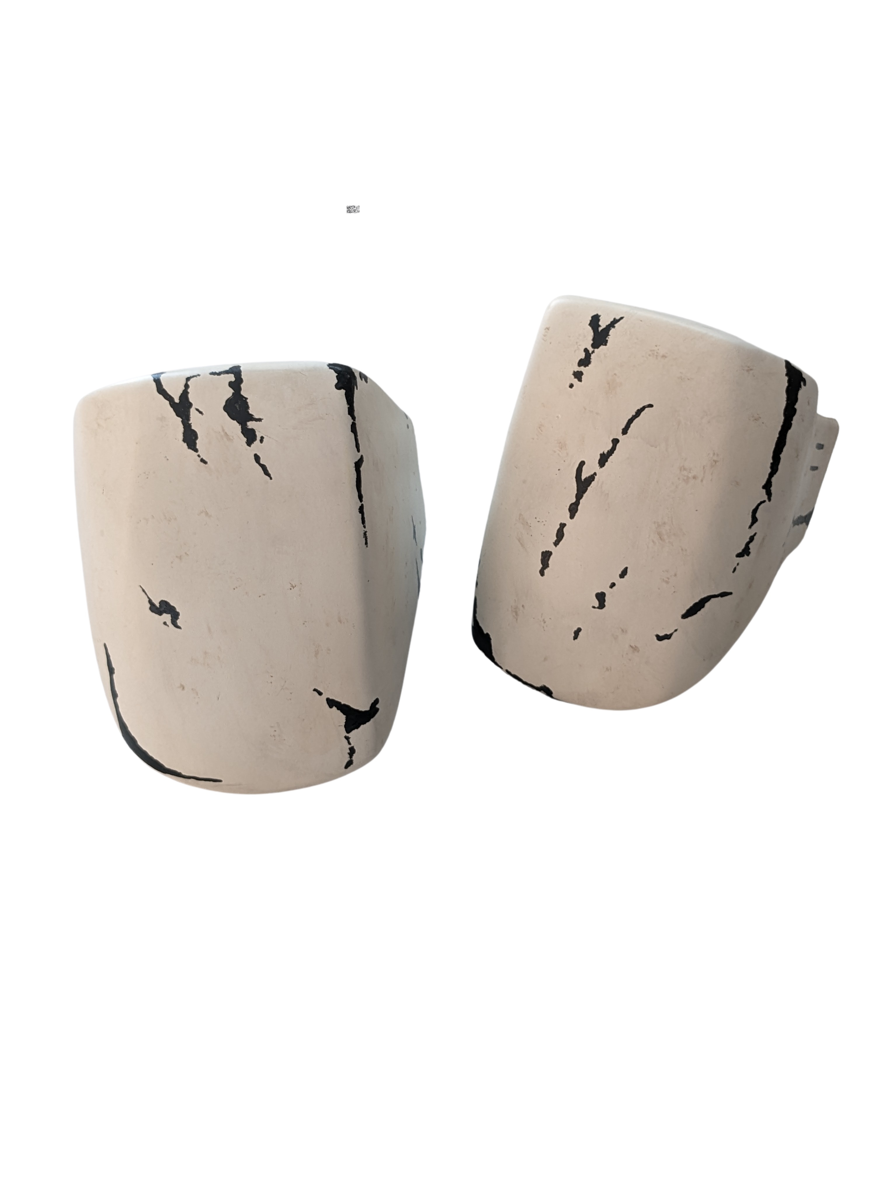 - Knees are strapped to the leg via a white strap with a raised center area that wraps around the leg and connects on both sides of the armor.