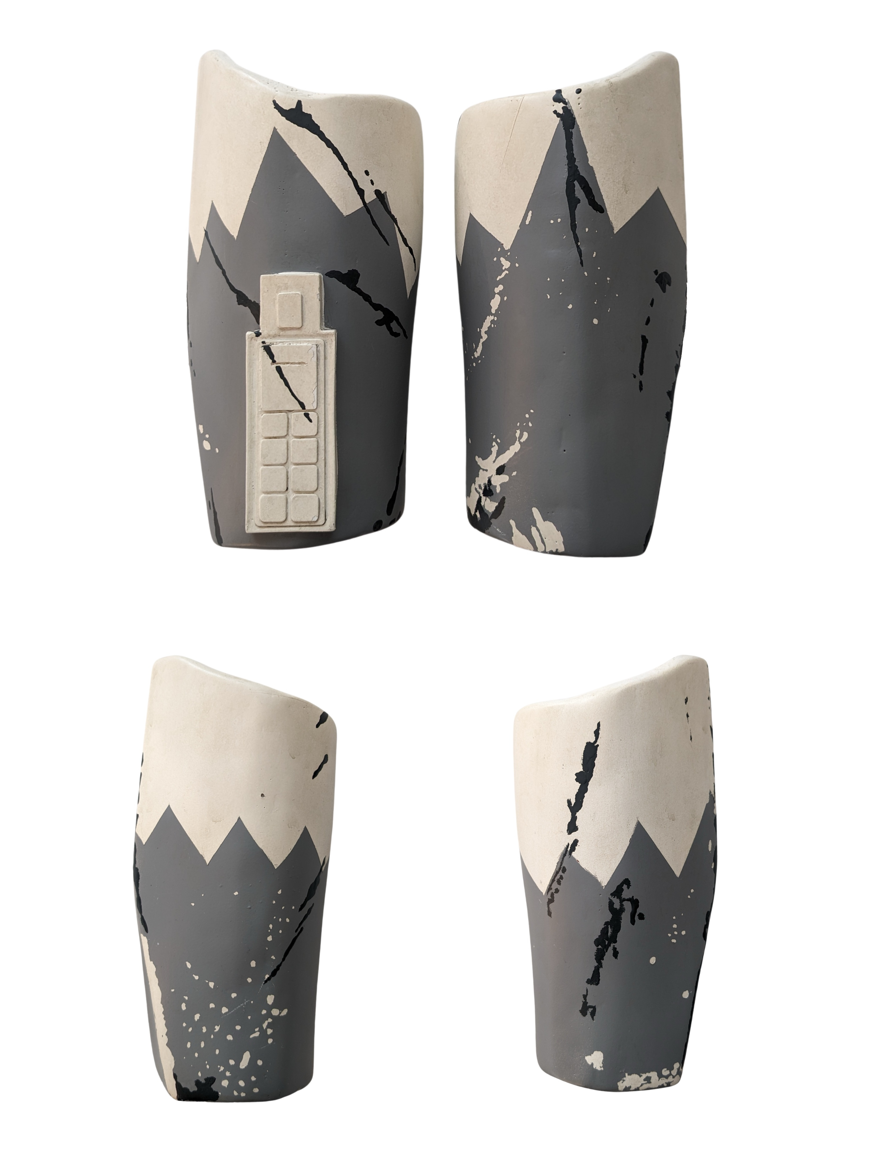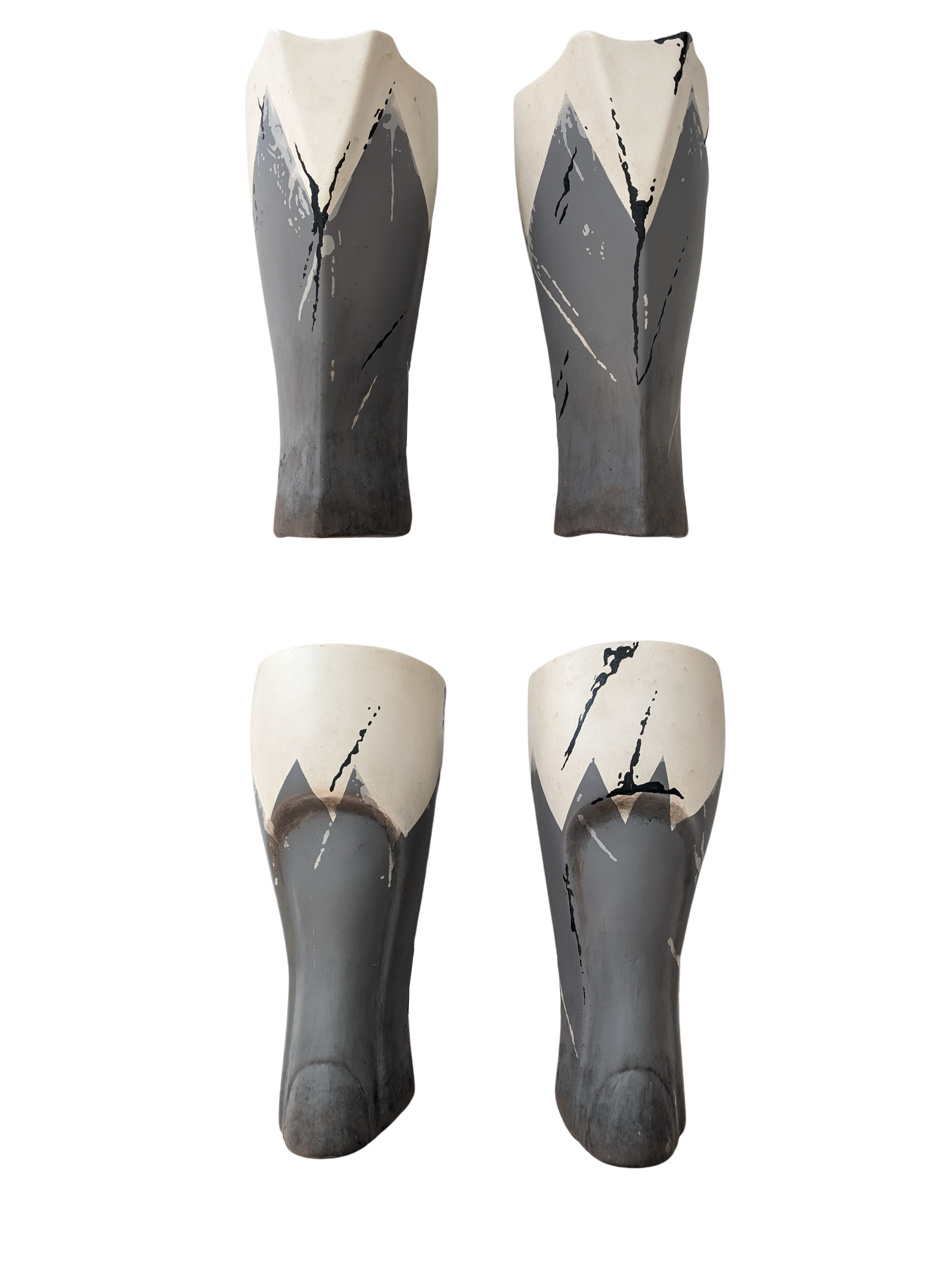 - The front of the armor has a triangular detail at the top of the leg and a hard ridge line down the front of the shin.