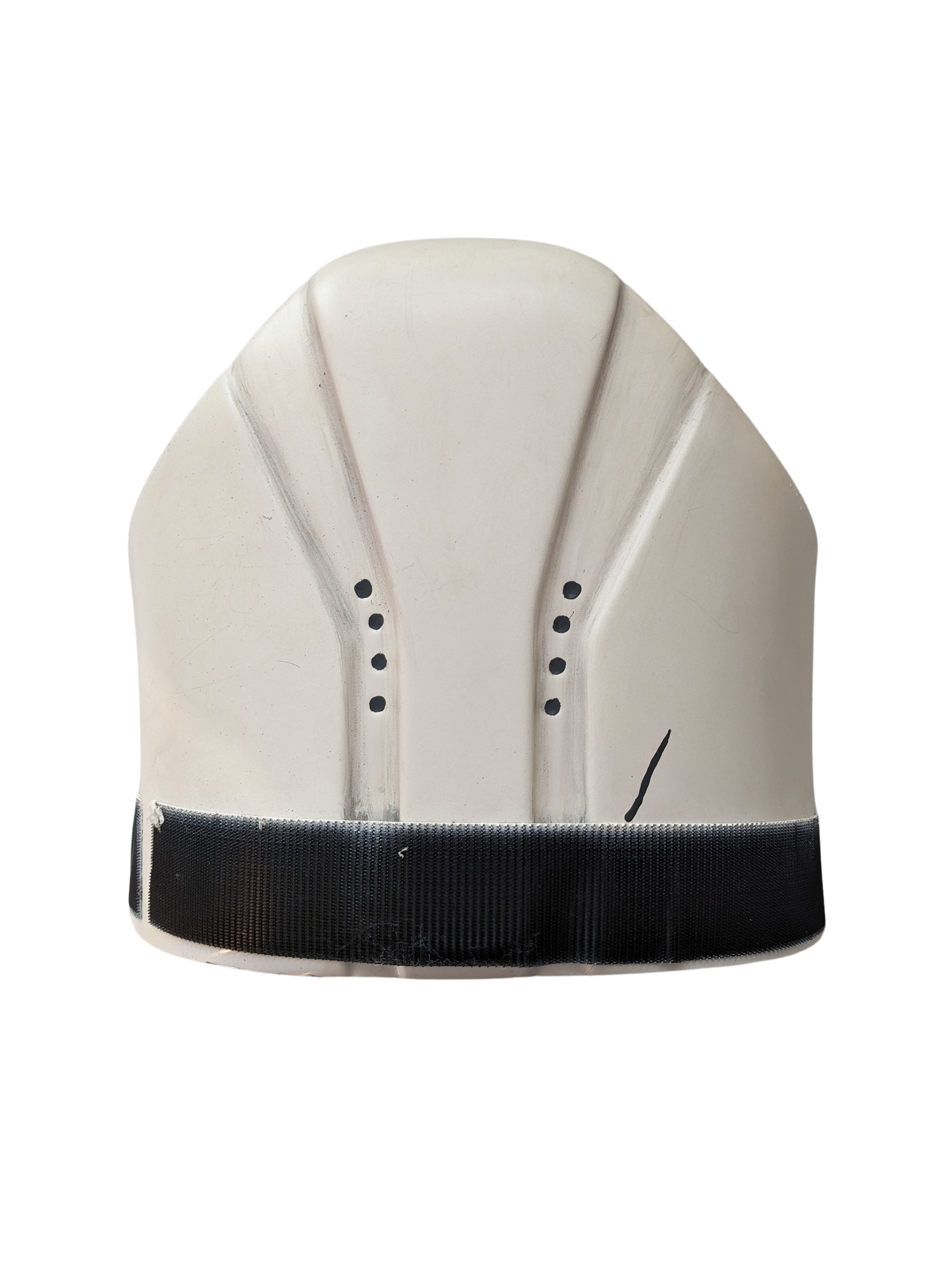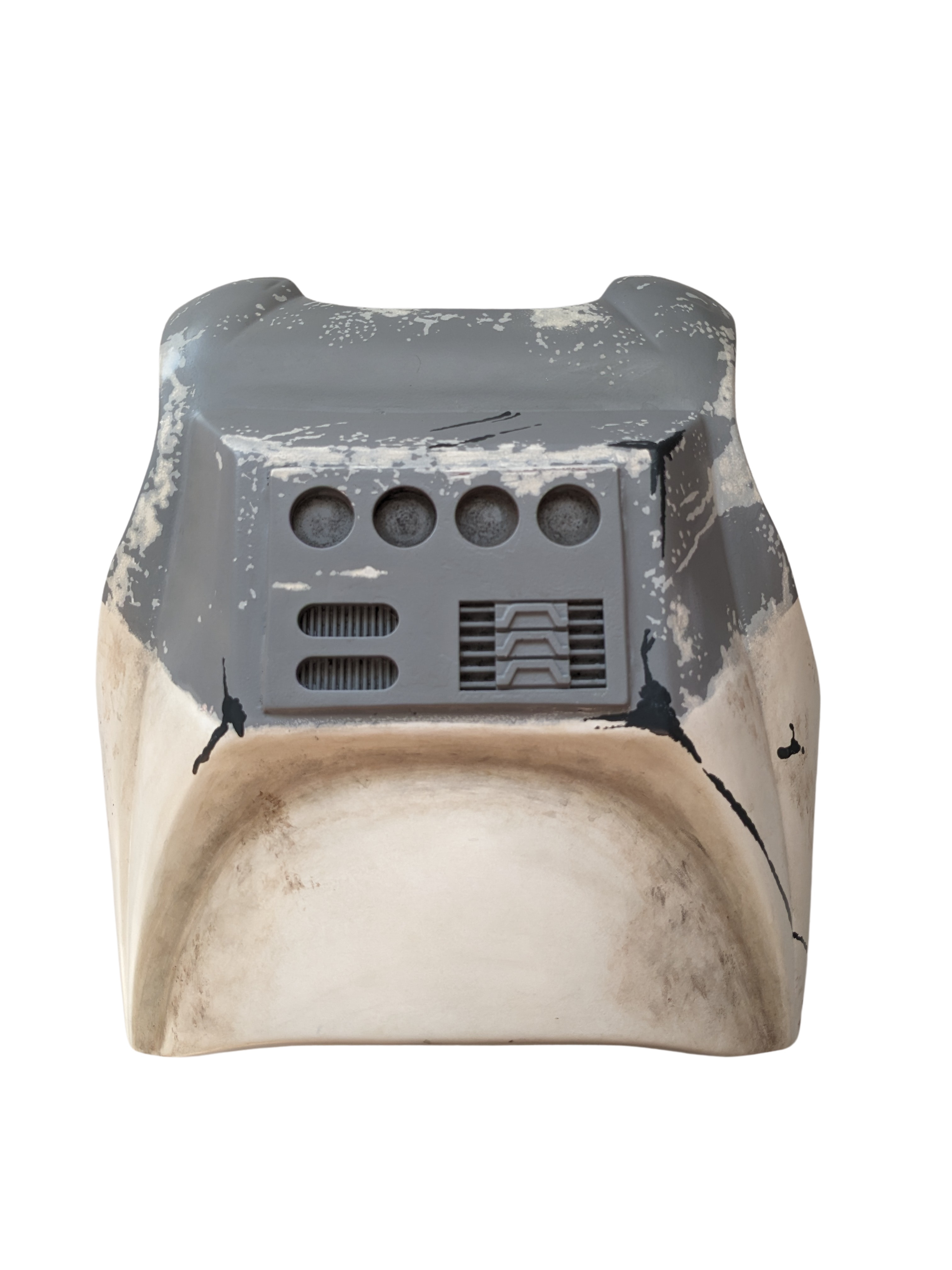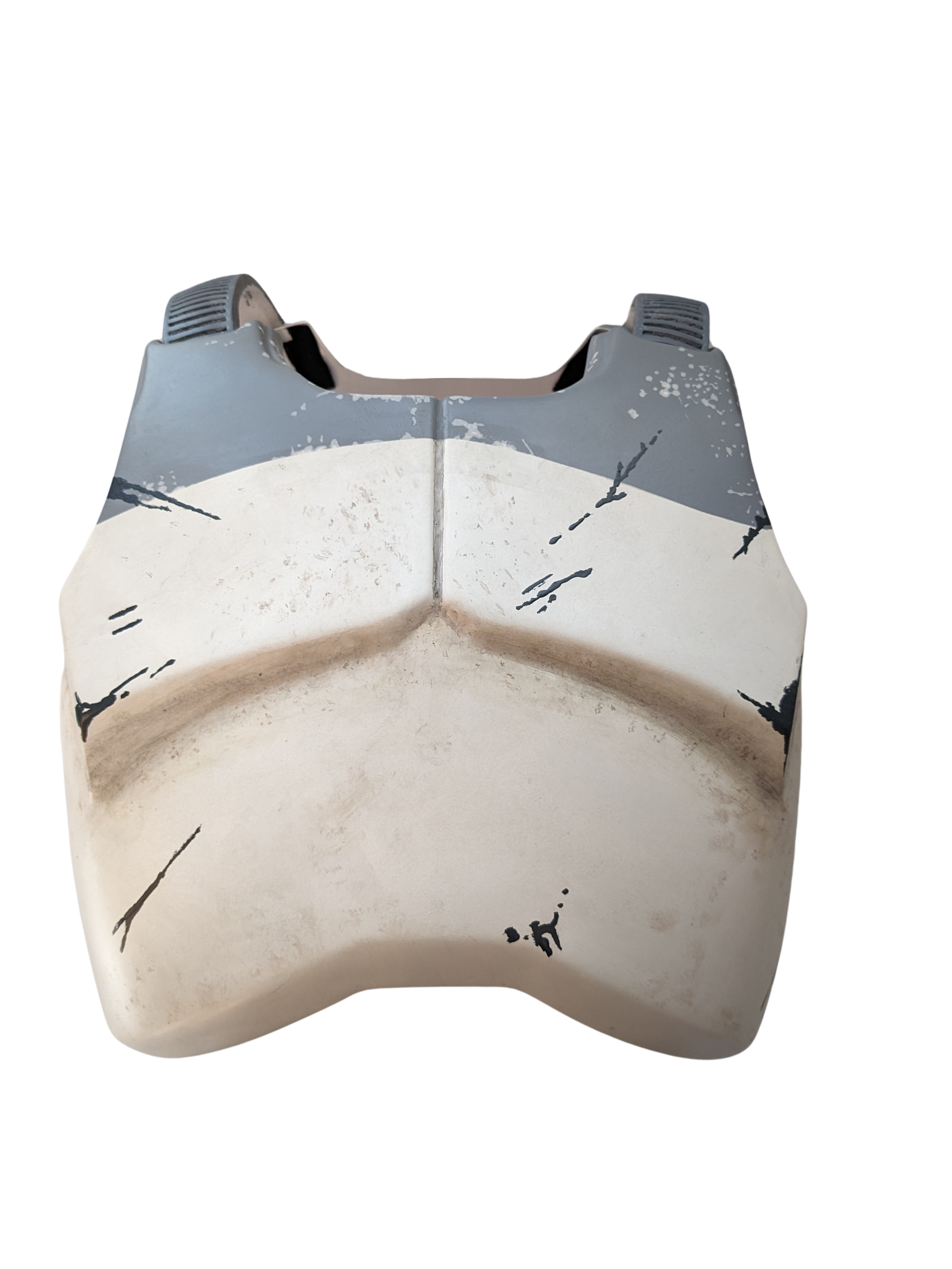 - Top portion of the chest armor is painted grey, with an arching edge.