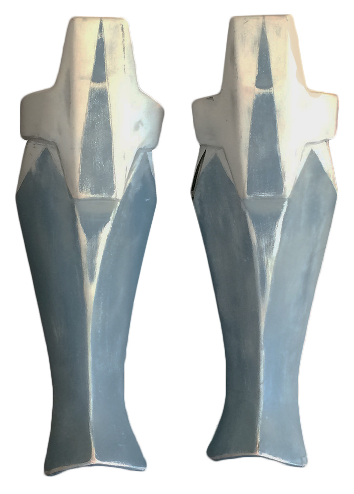 - Much of the lower shins are painted with a blue-gray, jagged peak design of varying heights.