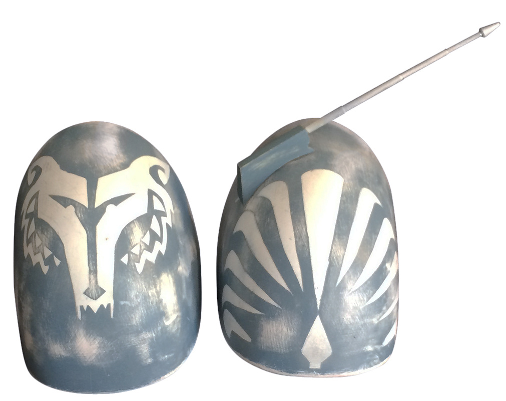 - The outside of each bicep is painted with a blue-gray, inverted 4-point design.